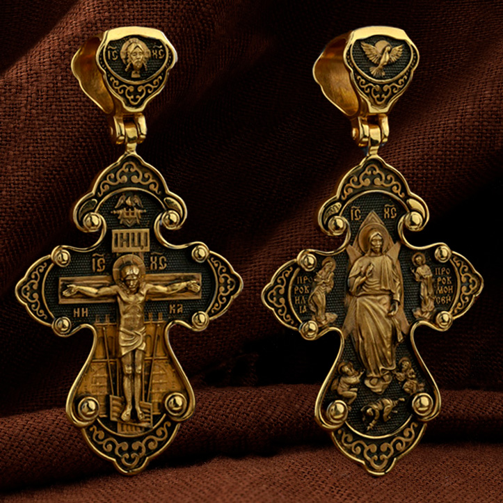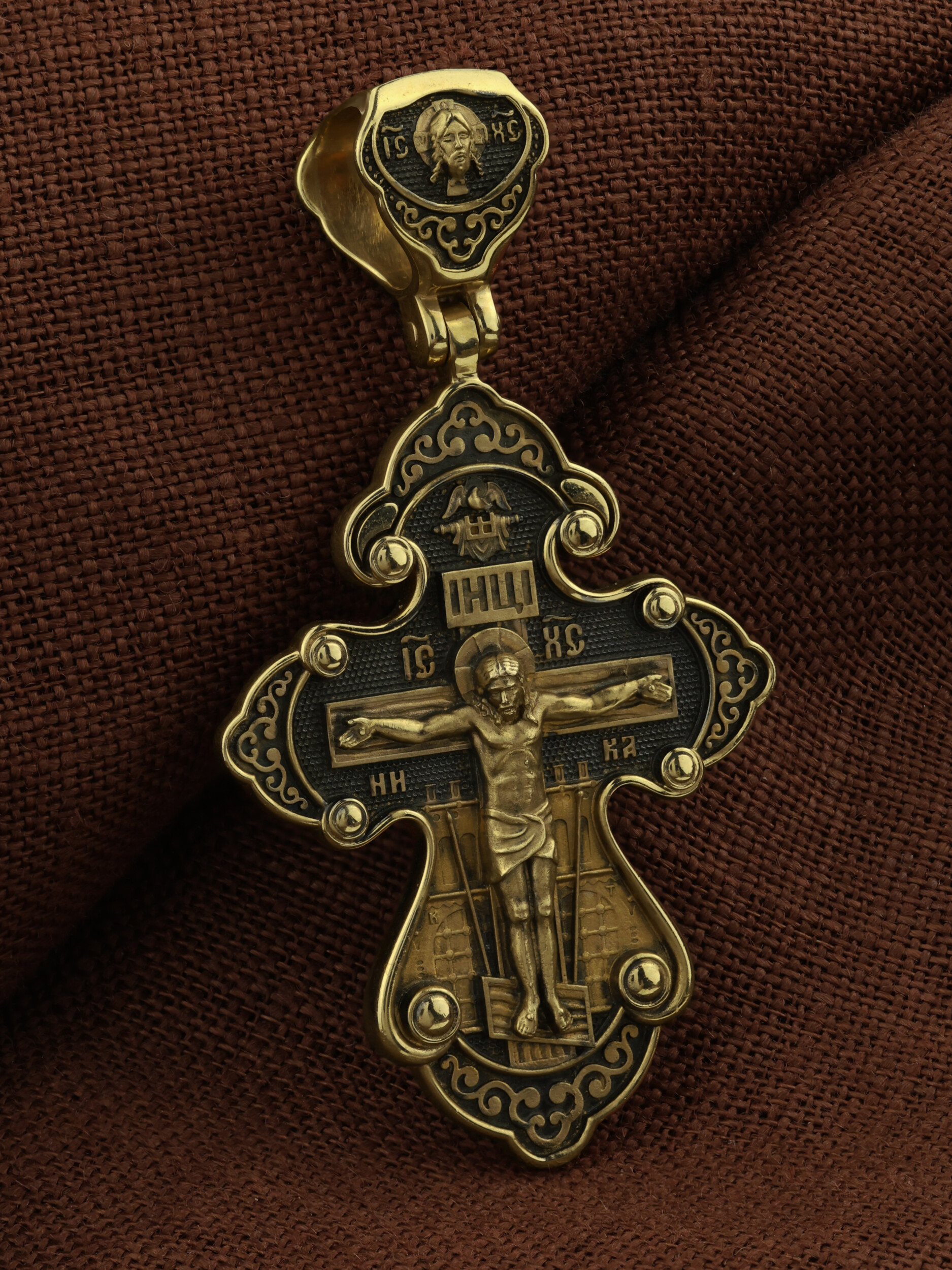 На лицевой стороне креста изображено Распятие Господа и Спасителя нашего Иисуса Христа, отдавшего Себя на смерть, для искупления грехов мира. Крест является символом жертвенной любви Всеблагого Бога к падшим людям, всепобеждающим духовным оружием христиан, основанием и средоточием церковной жизни. Господь сказал: кто хочет идти за Мною, отвергнись себя, и возьми крест свой, и следуй за Мною. (Мк. 8: 34). На верхней табличке, выше головы Иисуса, расположена надпись, составленная Понтием Пилатом — «IНЦI». Она означает «Иисус Назорей, Царь Иудейский». Надпись «IC» «ХC», означает Иисус Христос, помещается на разных сторонах поперечной перекладины креста. Рядом — слово «НИКА», что означает «победитель». За крестом высится Иерусалимская стена, в знак того, что Господь был распят вне стен города. На кулонном кольце изображен Нерукотворный образ Господа и Спасителя нашего Иисуса Христа, чудесно отпечатавшийся на плате, котором Христос вытер свой лик.