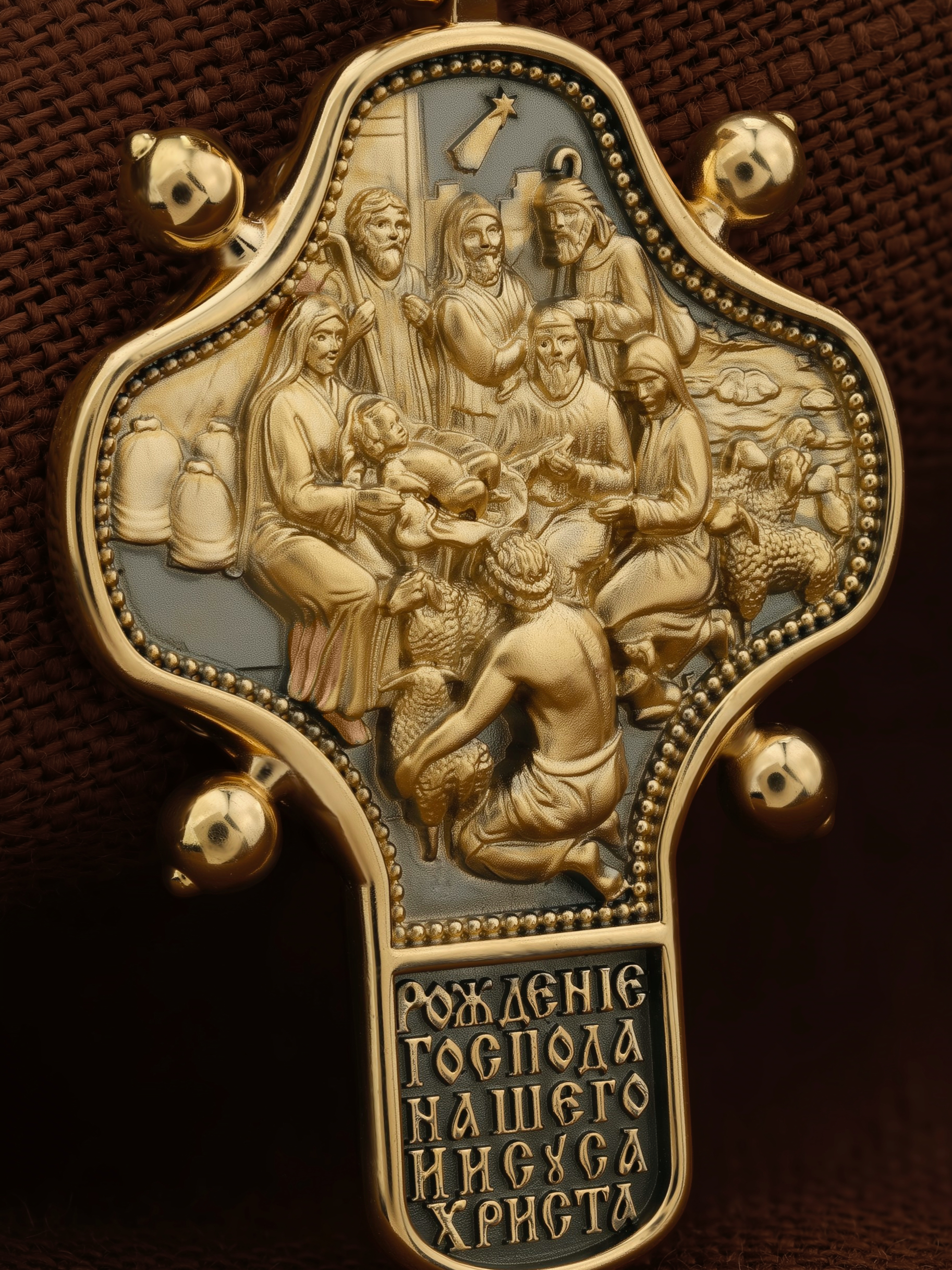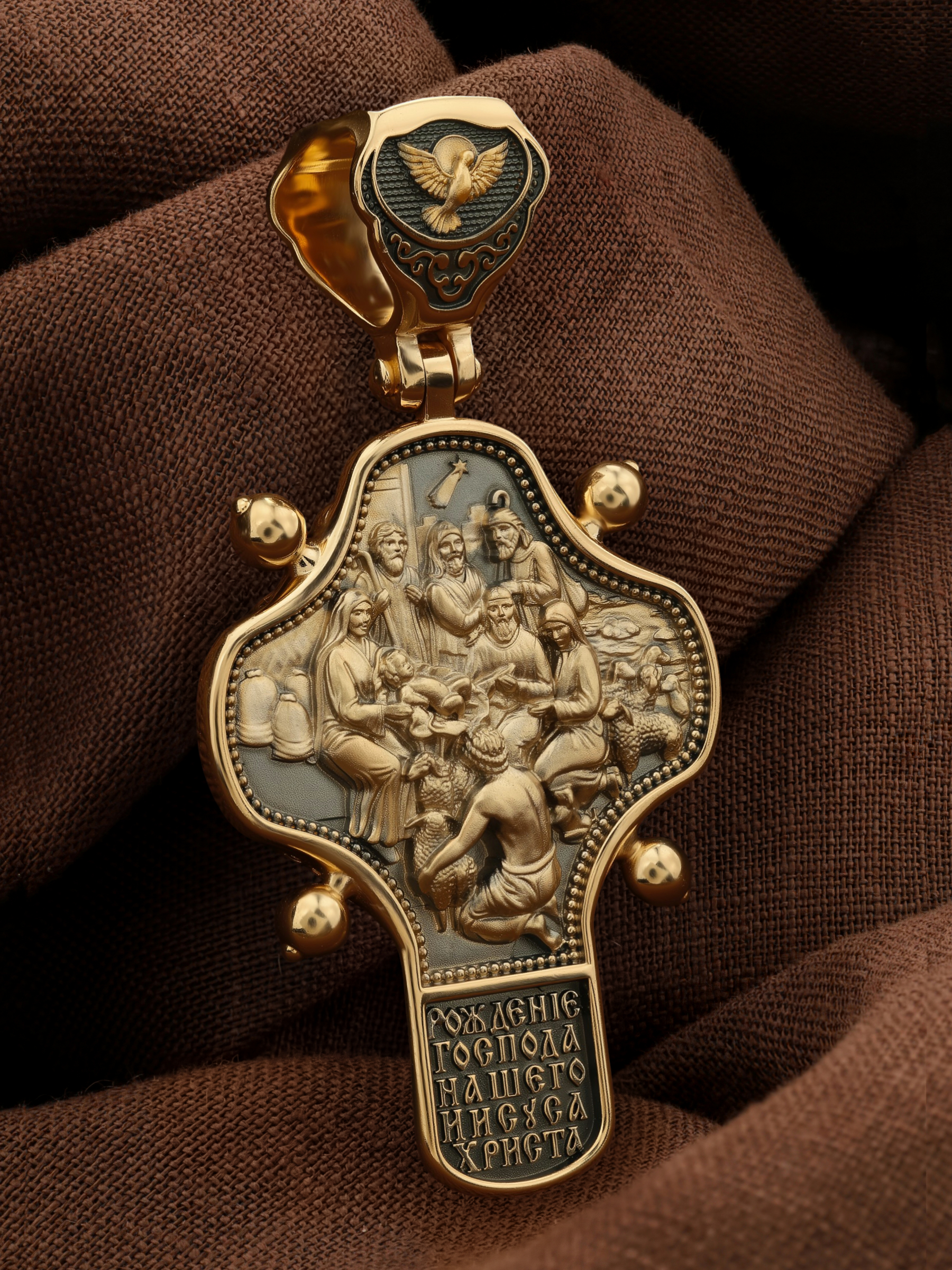 На оборотной стороне креста помещено изображение иконы «Рождество Христово». Господь Иисус Христос родился от Пресвятой Девы Марии в царствование императора Августа в городе Вифлееме. Как раз в это время Август повелел сделать всенародную перепись по всей своей империи, согласно которой каждый житель Палестины должен был идти в тот город, к которому испокон веков принадлежал его род. Пресвятая Богородица и праведный Иосиф, как происходившие от рода Давидова, должны были идти в Вифлеем (город Давида), чтобы внести свои имена в список подданных кесаря: «Пошел также и Иосиф из Галилеи, из города Назарета, в Иудею, в город Давидов, называемый Вифлеем, потому что он был из дома и рода Давидова, записаться с Мариею, обрученною ему женою, которая была беременна. Когда же они были там, наступило время родить Ей; и родила Сына своего Первенца, и спеленала Его, и положила Его в ясли, потому что не было им места в гостинице» (Лк.2:4−7).После рождения Спасителя на поле близ Вифлеема простым пастухам явились ангелы, благовествовавшие о пришествии в мир Христа песней славословия Господу: «Слава в вышних Богу, и на земли мир, в человецех благоволение!». Они повелели пастырям идти поклониться Младенцу. В это же время к Рожденному с дарами из дальних стран — златом, ливаном и смирной — пришли волхвы, которых к яслям Богомладенца привела воссиявшая в небе новая звезда. На кулонном кольце изображен Дух Святой в виде голубя сходящего с небес.