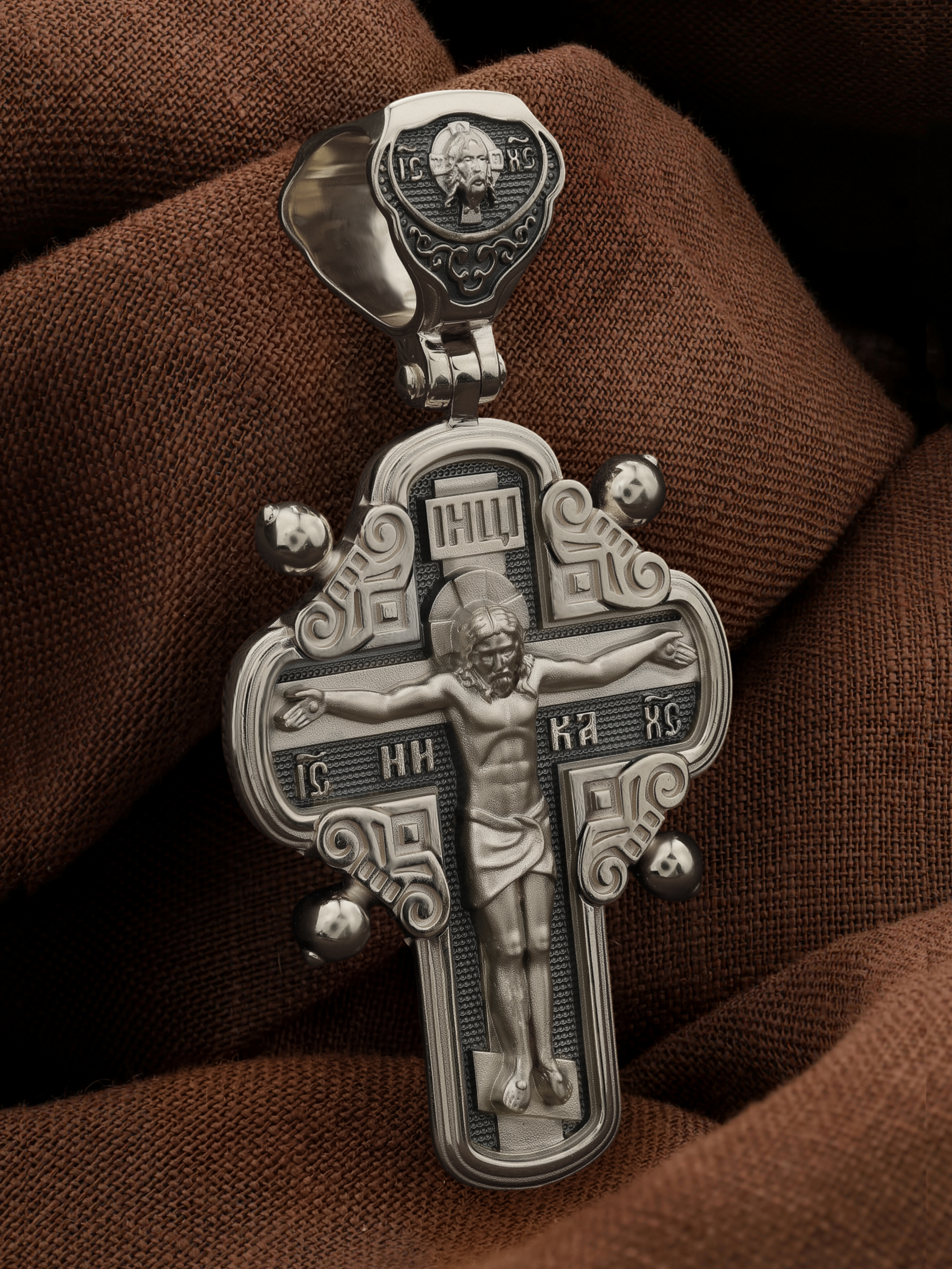 На лицевой стороне креста изображено Распятие Господа и Спасителя нашего Иисуса Христа, отдавшего Себя на смерть, для искупления грехов мира. Крест является символом жертвенной любви Всеблагого Бога к падшим людям, всепобеждающим духовным оружием христиан, основанием и средоточием церковной жизни. Господь сказал: кто хочет идти за Мною, отвергнись себя, и возьми крест свой, и следуй за Мною. (Мк. 8: 34). На верхней табличке, выше головы Иисуса, расположена надпись, составленная Понтием Пилатом — «IНЦI». Она означает «Иисус Назорей, Царь Иудейский». Надпись «IC» «ХC», означает Иисус Христос, помещается на разных сторонах поперечной перекладины креста. Рядом — слово «НИКА», что означает «победитель». На кулонном кольце изображен Нерукотворный образ Господа и Спасителя нашего Иисуса Христа, чудесно отпечатавшийся на плате, котором Христос вытер свой лик.
