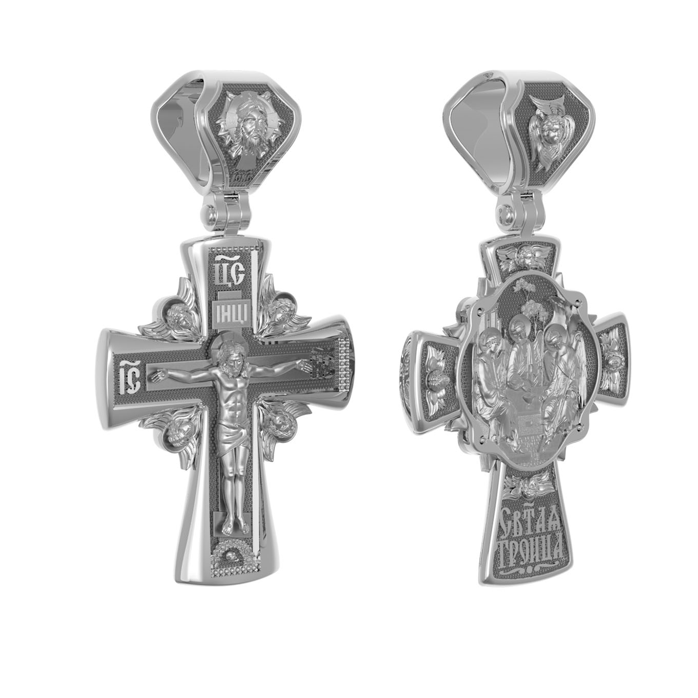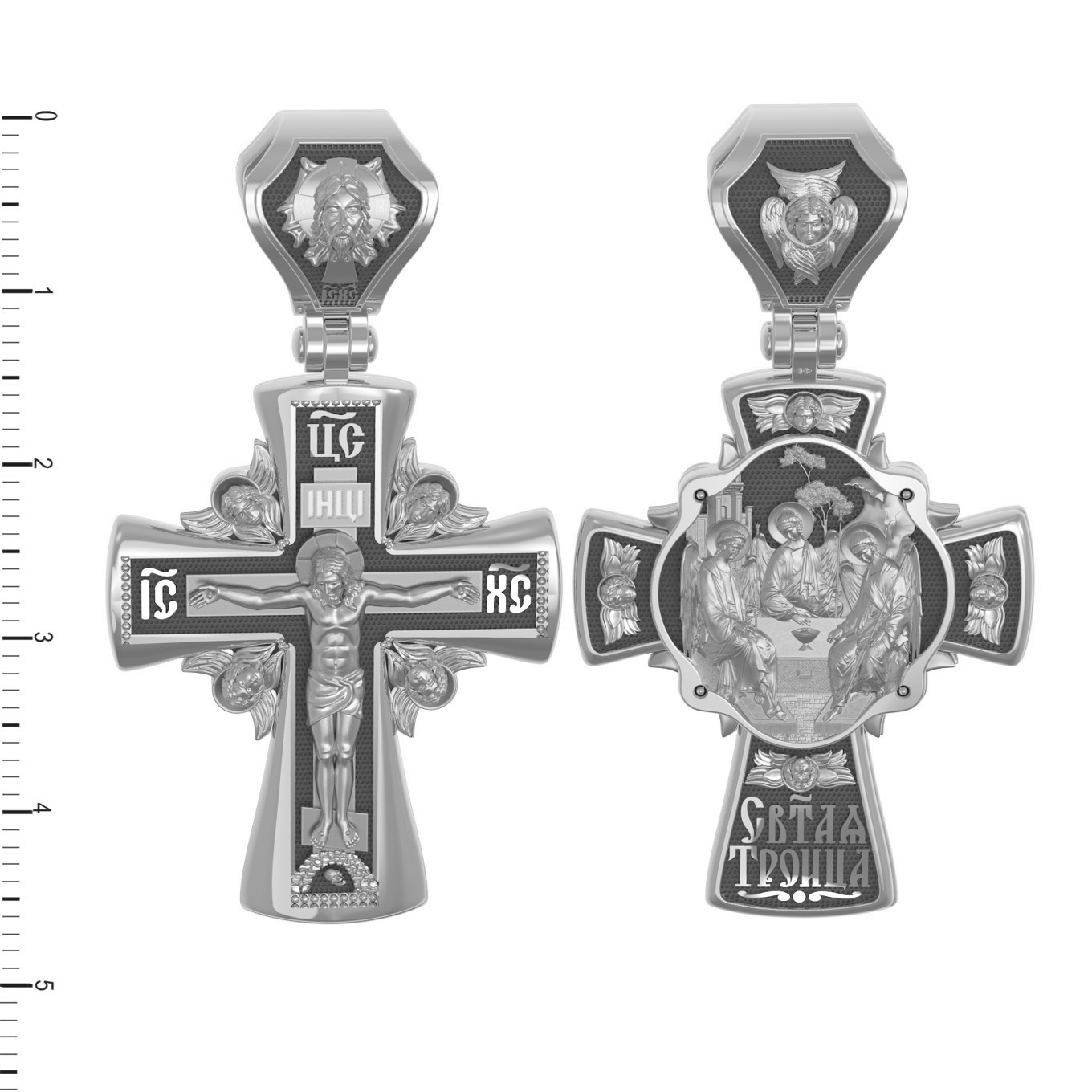 На оборотной стороне креста изображена икона Святой Троицы. На иконе изображены три ангела, являющихся образом Единосущного и Триипостасного Бога — Святой Троицы. Фигуры ангелов расположены так, что линии их фигур образуют как бы замкнутый круг. Три ангела безмятежно и неторопливо ведут беседу. Их позы непринужденны, одежды просты и свободны. В руках у них скипетры, символы власти. В центре иконы — чаша, как символ страданий Христа. За центральной фигурой — древо жизни, а левее от него — здание, символизирующее церковь. В правом верхнем углу изображена гора, как искупление падшего мира, прототип Голгофы, на которую взойдет Иисус. Единство трёх ипостасей Святой Троицы является совершенным прообразом всякого единения и любви — «Да будут все едино, как Ты, Отче, во Мне, и Я в Тебе, так и они да будут в Нас едино» (Ин.17:21). На кулонном кольце изображен шестикрылый Ангел — Серафим.