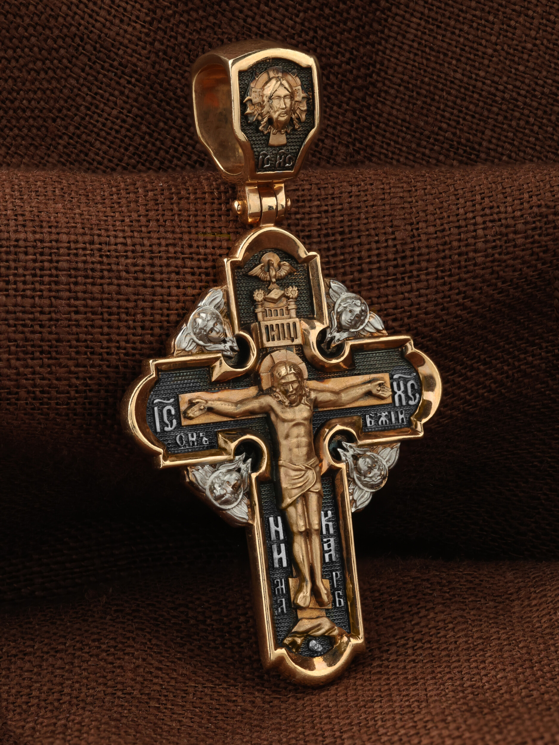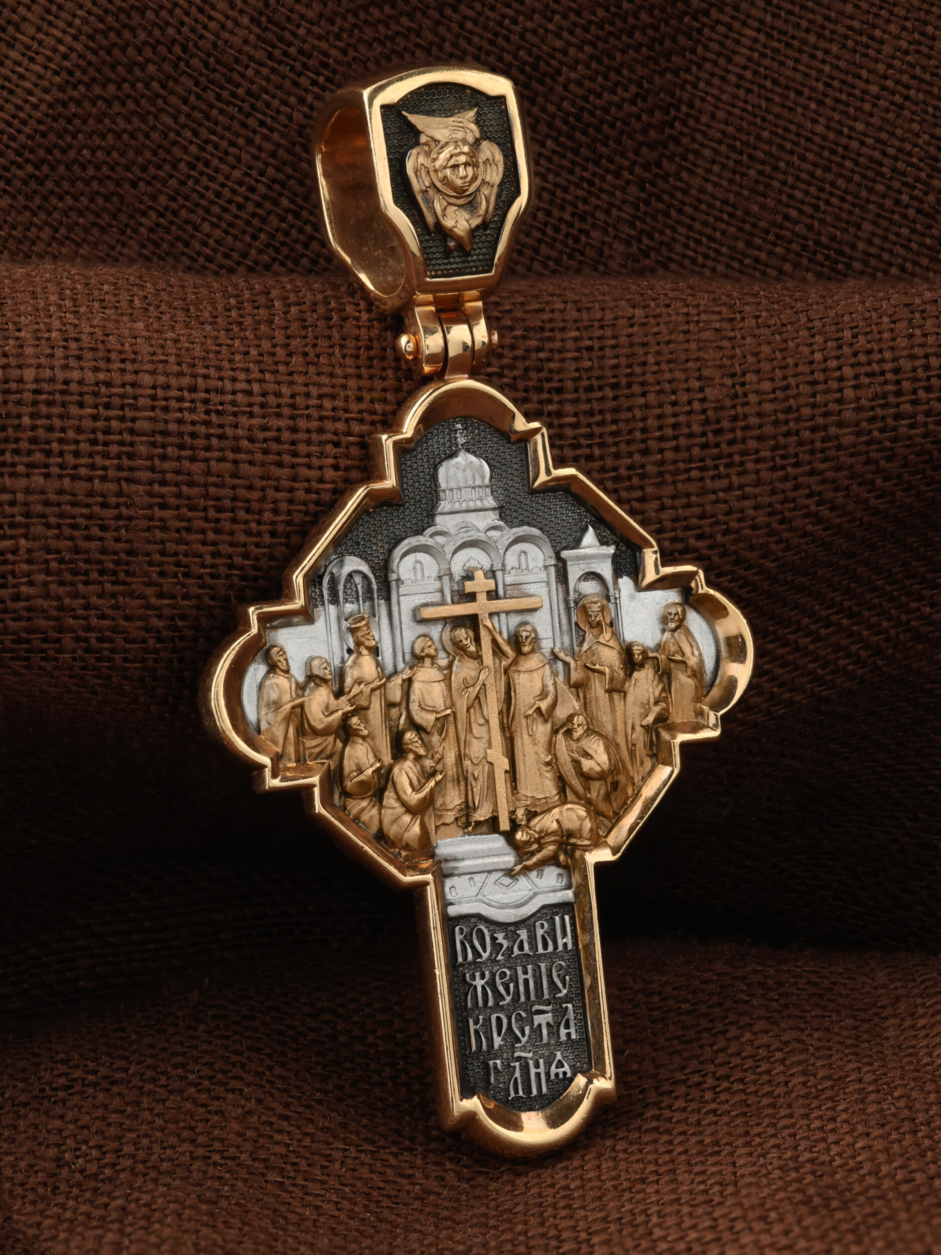 На оборотной стороне креста изображена икона Воздвижение Честного и Животворящего Креста Господня. Равноапостольный царь Константин пожелал построить храмы Божии на священных для христиан местах в Палестине и найти Крест, на котором был распят Спаситель. Исполнить желание царя взялась, с великою радостью, его мать, св. равноапостольная царица Елена. Крест был обретен в 326 году около горы Голгофы в Иерусалиме. C VII века с этим днём стали соединять память о возвращении Животворящего Креста из Персии византийским императором Ираклием (629). Праздник называется Воздвижением Креста, потому что и при обретении, и при возвращении Креста патриарх Макарий поднимал (Воздвигал) крест три раза, чтобы все могли его видеть. Народ же, видя Крест Спасителя, кланялся и восклицал: «Господи, помилуй!». Св. равноапостольные цари Константин и Елена, над местом страданий, погребения и воскресения Иисуса Христа построили обширный и великолепный храм в честь Воскресения Христова. На кулонном кольце изображен шестикрылый Ангел — Серафим.