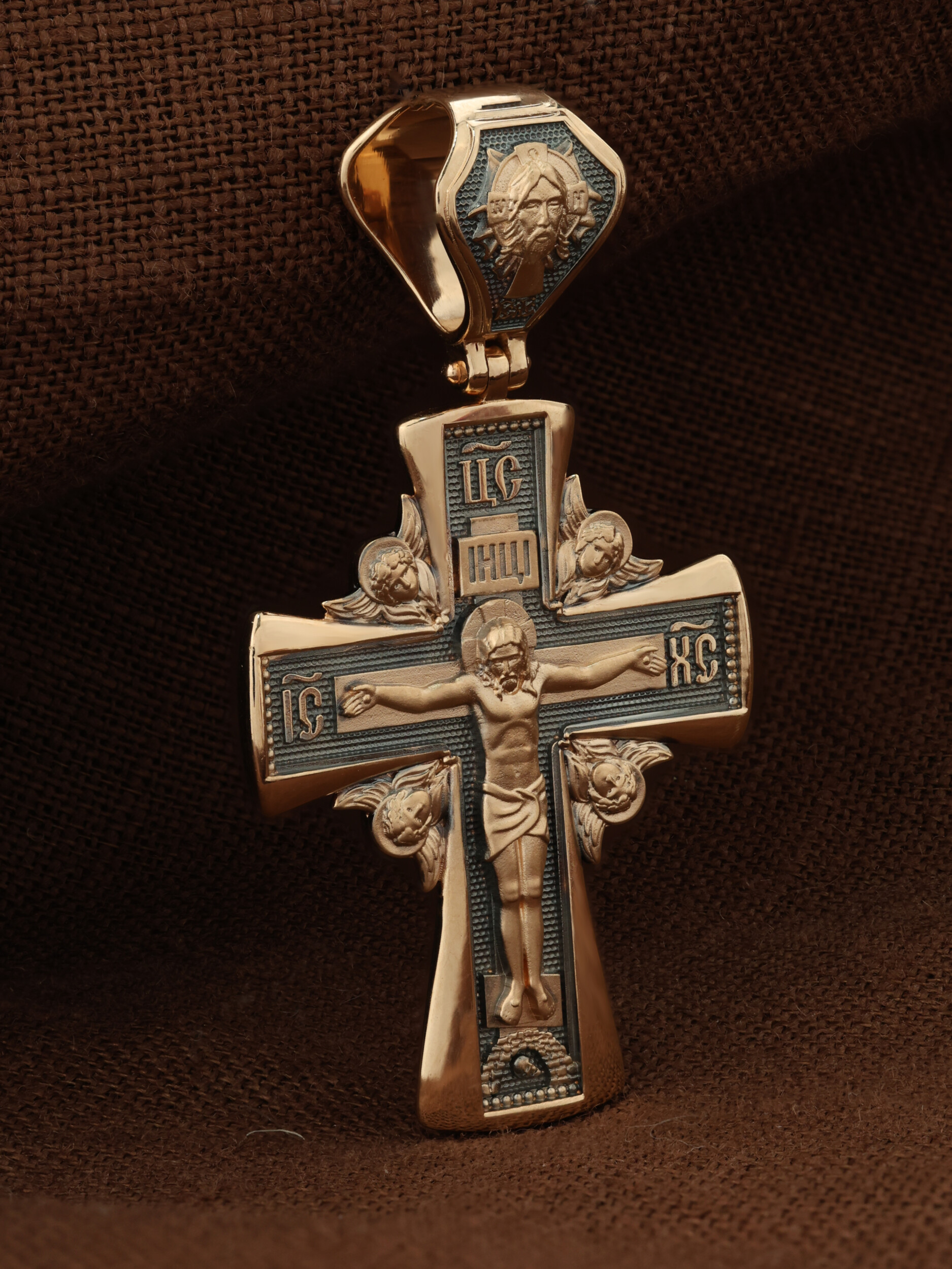 На лицевой стороне креста изображено Распятие Господа и Спасителя нашего Иисуса Христа, отдавшего Себя на смерть, для искупления грехов мира. Крест является символом жертвенной любви Всеблагого Бога к падшим людям, всепобеждающим духовным оружием христиан, основанием и средоточием церковной жизни. Господь сказал: кто хочет идти за Мною, отвергнись себя, и возьми крест свой, и следуй за Мною. (Мк. 8: 34). Над Распятием помещена надпись «Царь Славы». На верхней табличке, выше головы Иисуса, расположена надпись, составленная Понтием Пилатом — «IНЦI». Она означает «Иисус Назорей, Царь Иудейский». Надпись «IC» «ХC», означает Иисус Христос, помещается на разных сторонах поперечной перекладины креста. Возвышение, на котором стоит Крест, символизирует гору Голгофу, на которой произошло Распятие. Под подножием Креста изображена покоящаяся голова (череп) Адама. На кулонном кольце изображен Нерукотворный образ Господа и Спасителя нашего Иисуса Христа, чудесно отпечатавшийся на плате, которым Христос вытер свой лик.