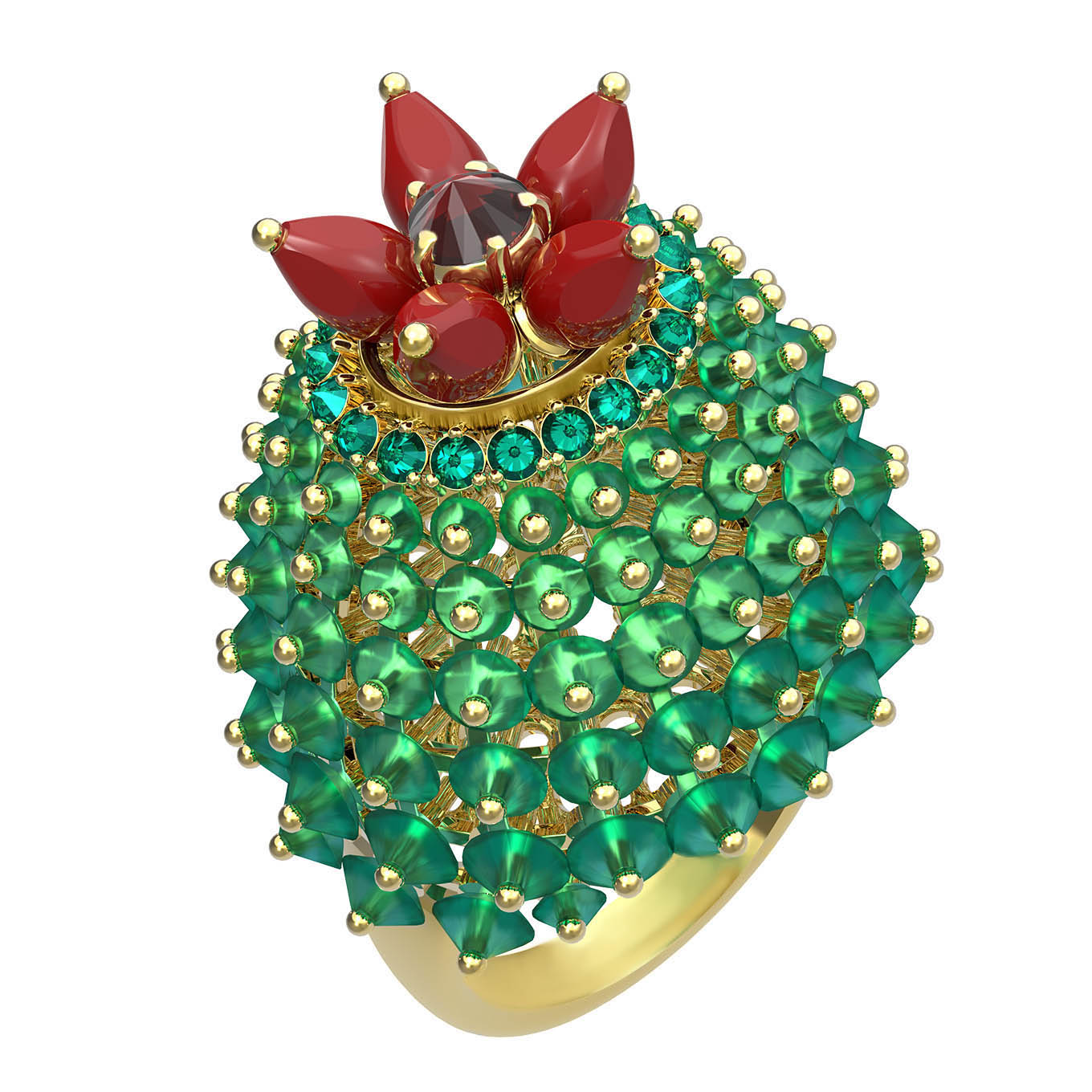 Кольцо из лимонного золота c гранатом, хризопразом, изумрудом и кораллом