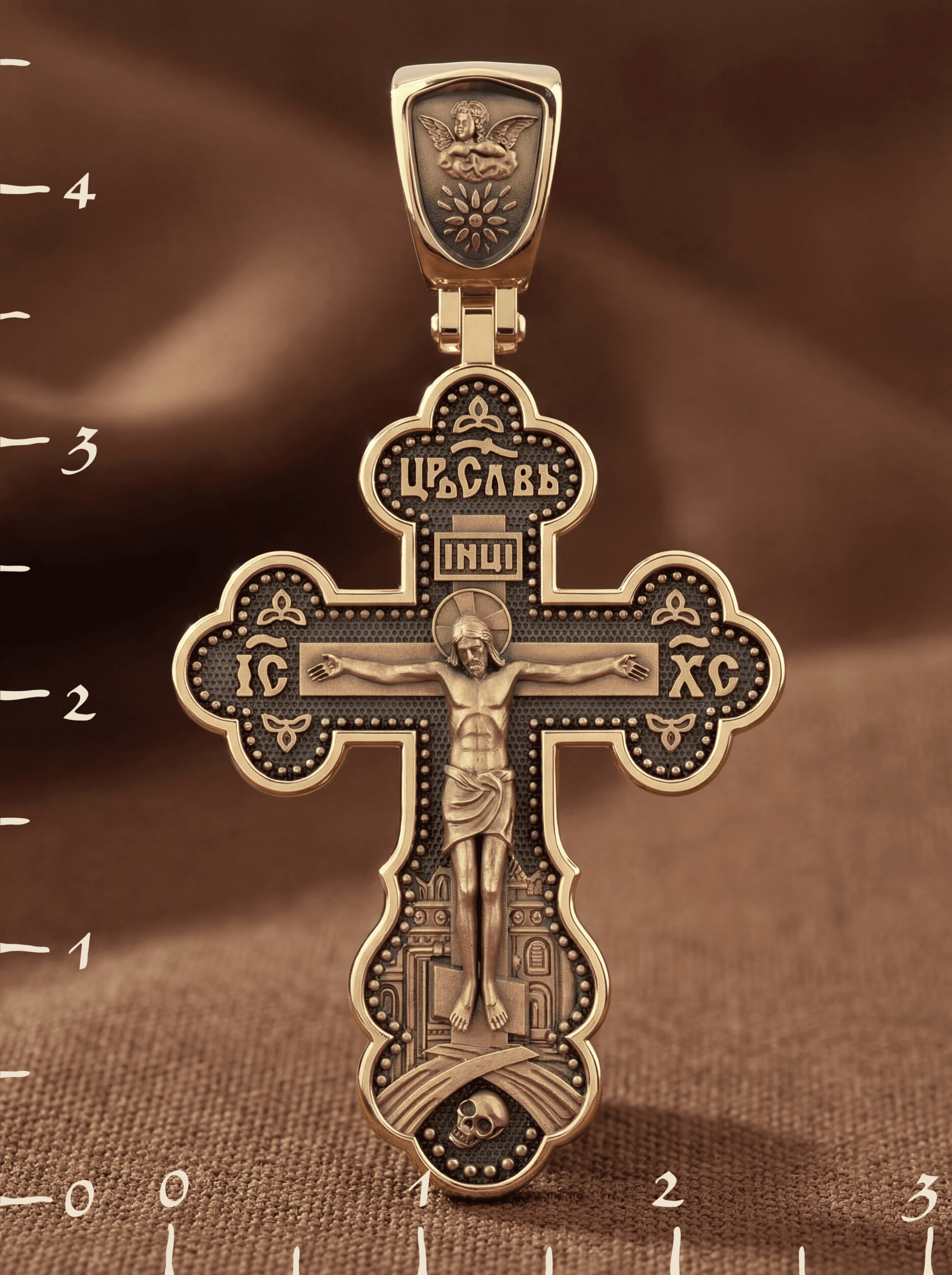 На лицевой стороне креста изображено Распятие, потому что это орудие казни Иисус Христос сделал орудием победы над грехом и смертью. Своими страданиями Он искупил грехи человечества, умерев и сошествовав во ад, победил сатану, освободил души праведников от вечной смерти и открыл им небесные врата рая. Жертва Христа сделала возможным спасение для каждого человека. На православном кресте Христос не умирает, а свободно простирает руки, ладони Иисуса открыты, будто он хочет обнять все человечество, даря им свою любовь и открывая путь к вечной жизни. Над титлом видим слова «ЦРЬ СЛВЫ» — Царь Славы. Верхняя перекладина символизирует собой табличку с надписью «IHЦI» — Иисус Назарянин Царь Иудейский. Возле перекладины пишется сокращенно имя Спасителя «IC XC» — Иисус Христос. Возвышение, на котором стоит Крест, символизирует гору Голгофу, на которой произошло Распятие. У подножия Креста изображают прах Адама, обозначенный черепом.