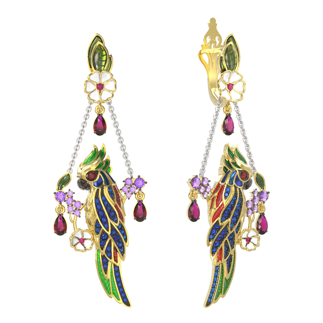 Серьги из лимонного золота c эмалью, гранатом, аметистом, рубином, аметистом и сапфиром