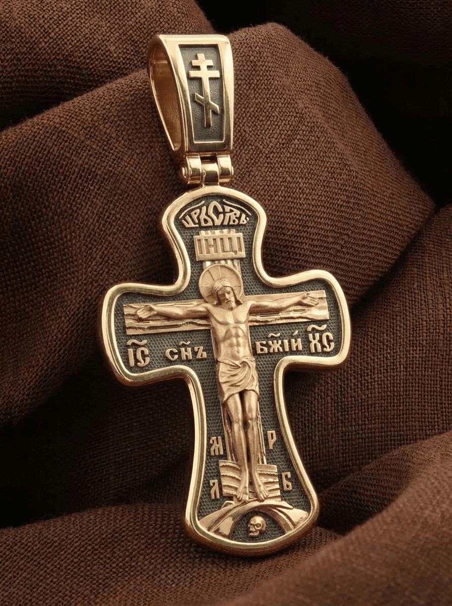 Основой композиции лицевой стороны креста является Распятие Иисуса Христа. С обеих сторон горизонтальной перекладины надписи: монограмма святого имени Христа — «ИС ХС», а под ней «Сын Божий». Над головой Господа на поперечной перекладине аббревиатура «IНЦI», что символизирует «Иисус Назорей Царь Иудейский». Венчает лицевую сторону креста надпись «Царь Славы». В подножии мы видим изображенную гору Голгофу в виде скалистой горки, а так же буквы «МЛ» «РБ», которые означают: «Место Лобное Рай Бысть». Крест стоит на горе камней, символизирующих Голгофу, в основании которой различается череп. Это голова Адама.