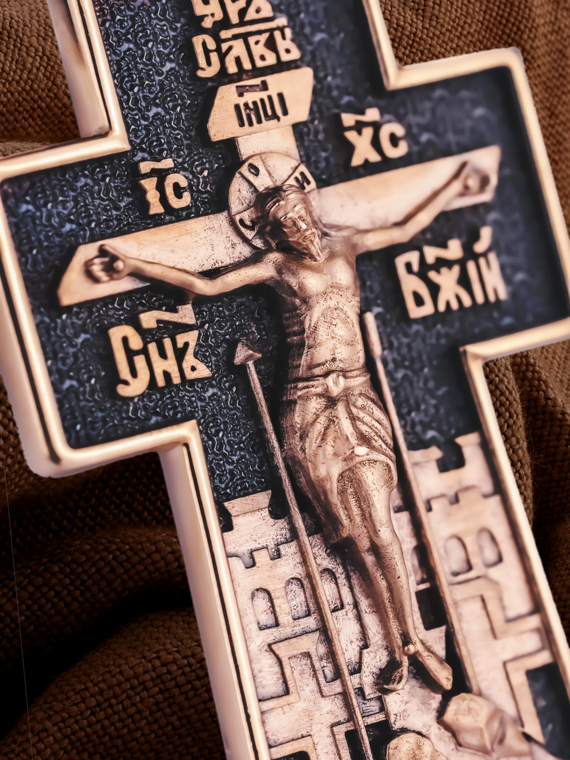 На лицевой стороне креста изображено Распятие Иисуса Христа. Господь представлен свободно покоящимся на кресте с простертыми руками и как бы обнимающим всю Вселенную. Рядом с Его образом помещены слова «Царь Славы». Эти слова характеризуют Господа как Великого Архиерея, победителя смерти. Верхняя перекладина символизирует титло — табличку, на которой, согласно Евангелию, было начертано: «Иисус Назорей Царь Иудейский» (IНЦI). Также Распятие сопровождается надписями, олицетворяющими Христа. Это святое имя Христа «IC» (Иисус) «ХС» (Христос), и словосочетание «Сын Божий». Возвышение, на котором стоит Крест, символизирует гору Голгофу, на которой произошло Распятие. У подножия Креста изображают прах Адама, обозначенный черепом. Позади — Иерусалимская стена.