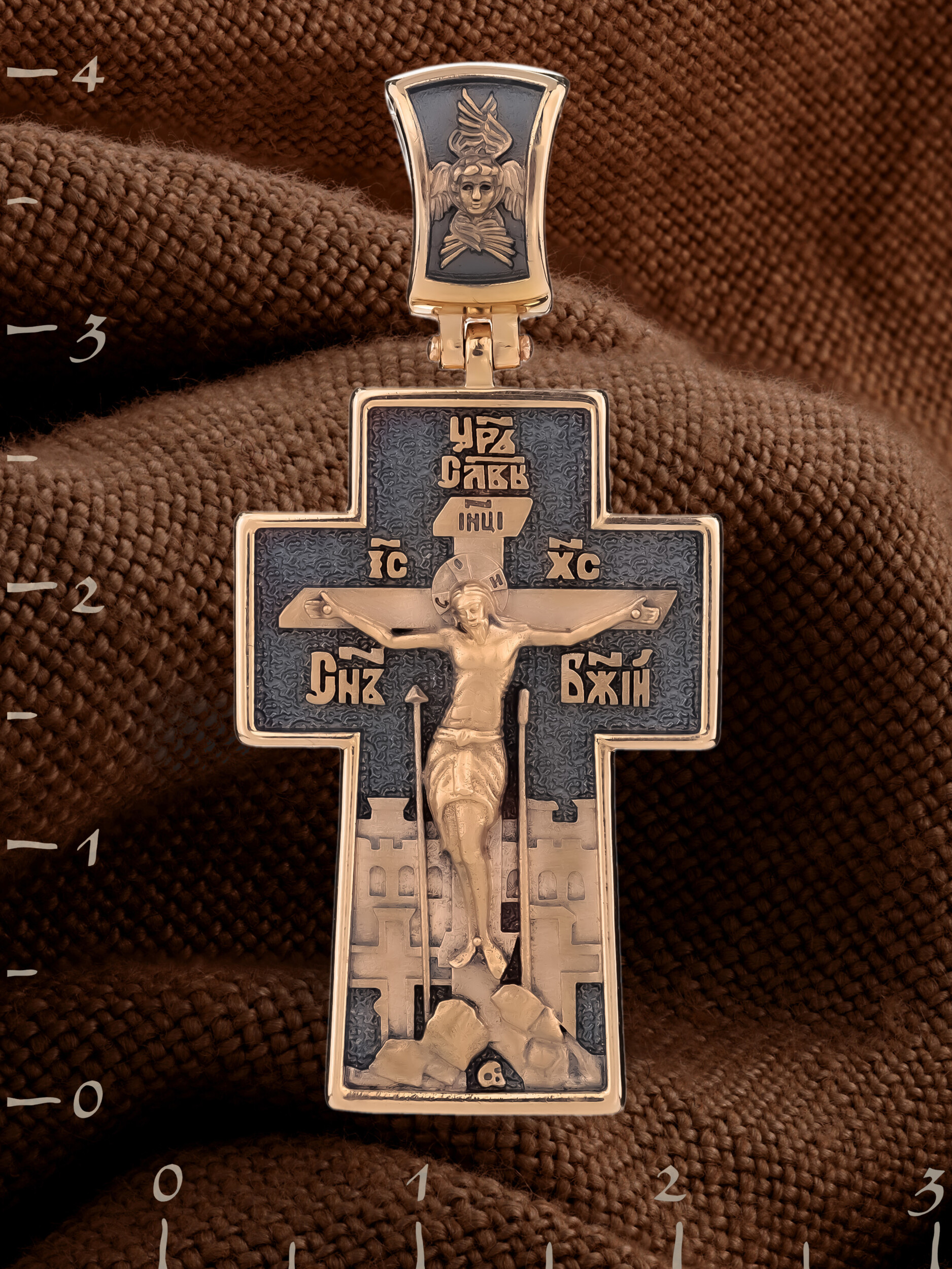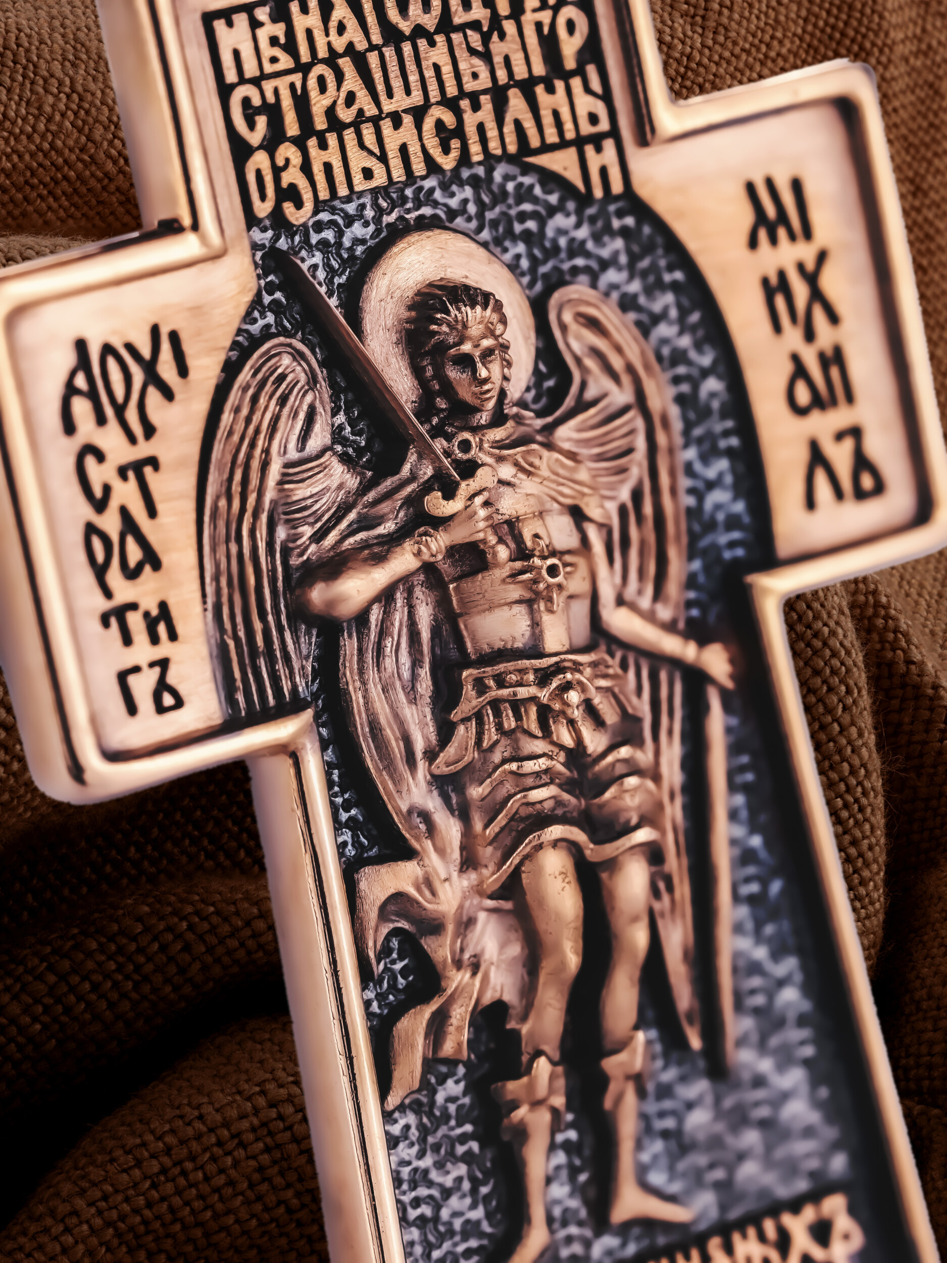 В центре оборота креста изображен Архистратиг Михаил. Могучий Архангел почитается как покровитель воинов и всех верных Богу и ведущих борьбу против сил зла, а также защитник душ умерших, страж райских врат. Вокруг его образа написаны слова: «Небесного царя страшный, грозный, сильный, крепкий небесных сил воевода Архистратиг Михаил».На кулонном кольце изображен Спас Нерукотворный — Символ вочеловечившегося Божества и шестикрылый Серафим — самый приближенный к Господу Ангел.