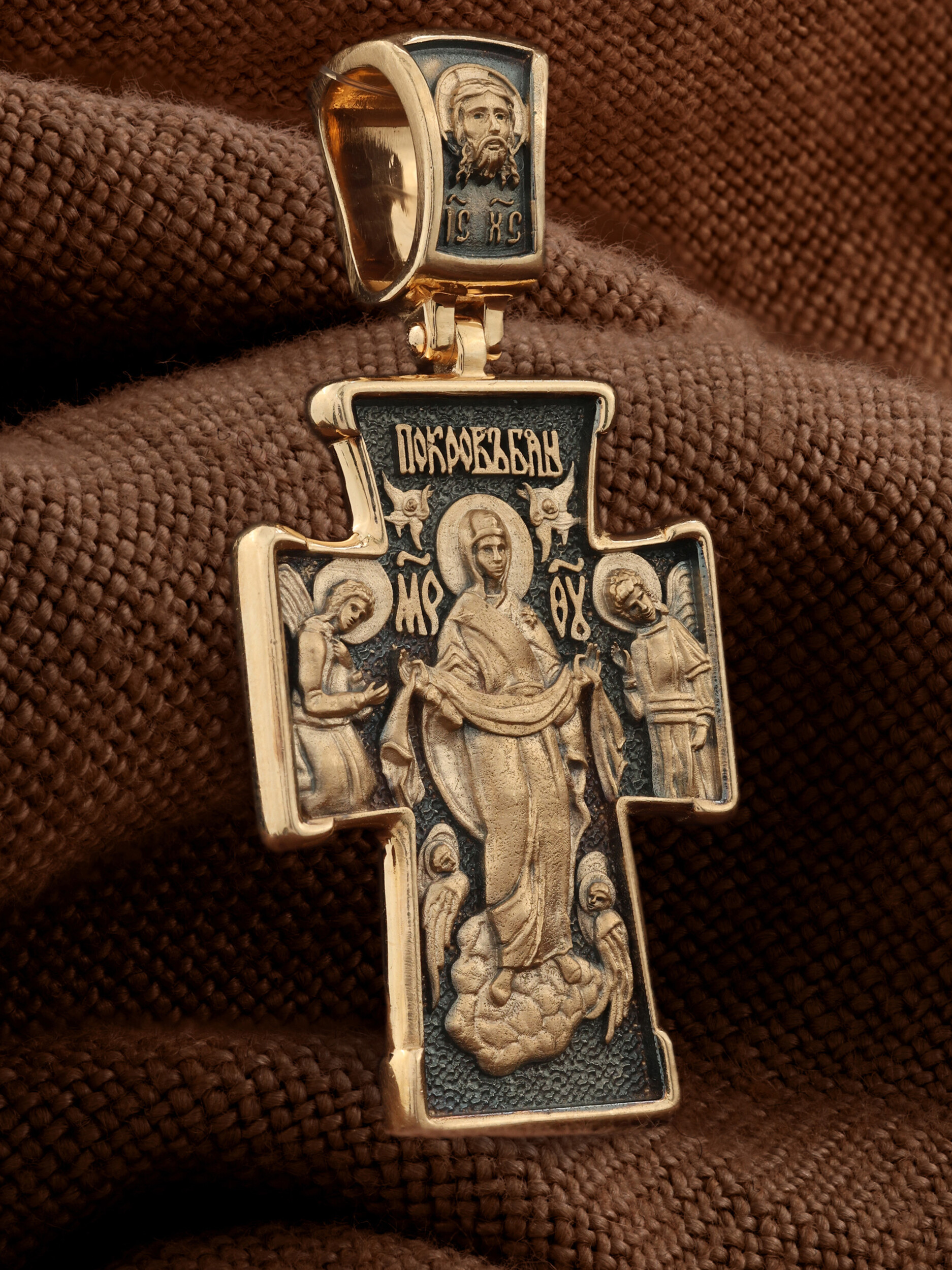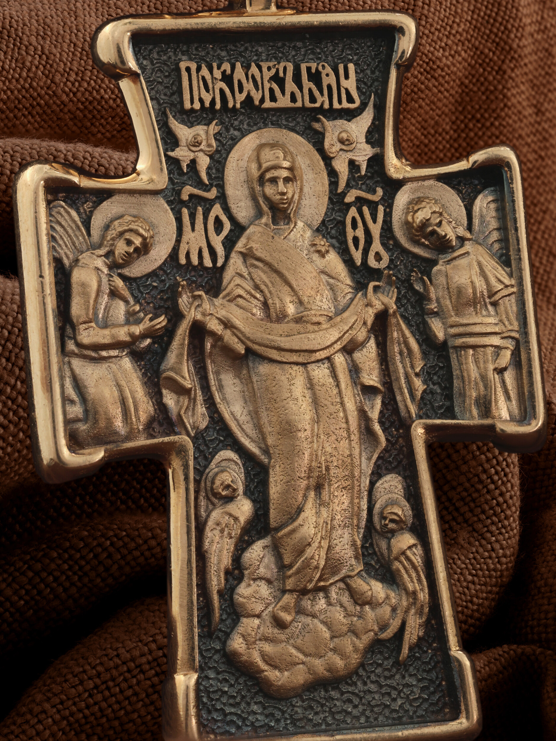 На обороте креста изображена икона Покрова Пресвятой Богородицы. Праздник Покрова Божией Матери является воспоминанием чуда, которое произошло во Влахнернской церкви 1 (14) октября 910 года: Пресвятая Богородица явилась верующим над алтарем храма и распростерла над ними Свое покрывало. В этот день Божия Матерь открыла людям, что Она является Ходатаицей за них перед Богом. Богородица простирает Свой молитвенный покров над всеми православными христианами и умоляет Сына Своего о даровании вечного спасения каждому человеку.