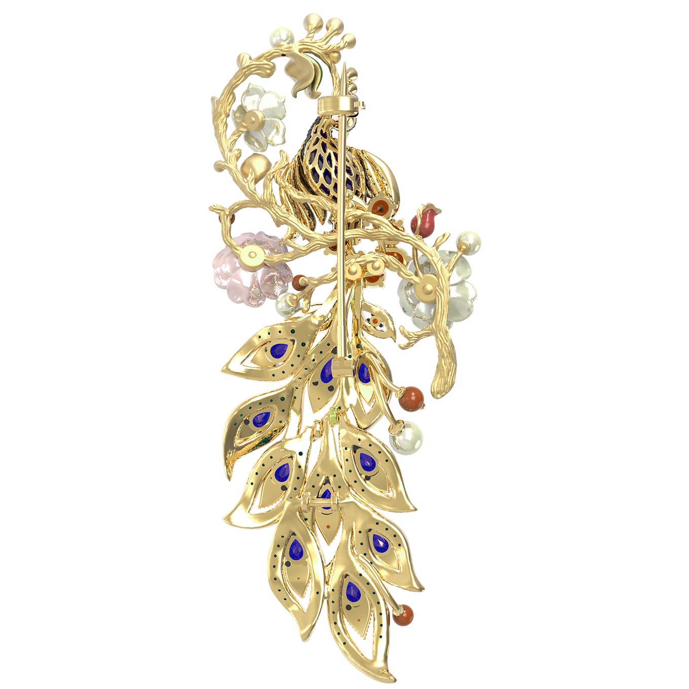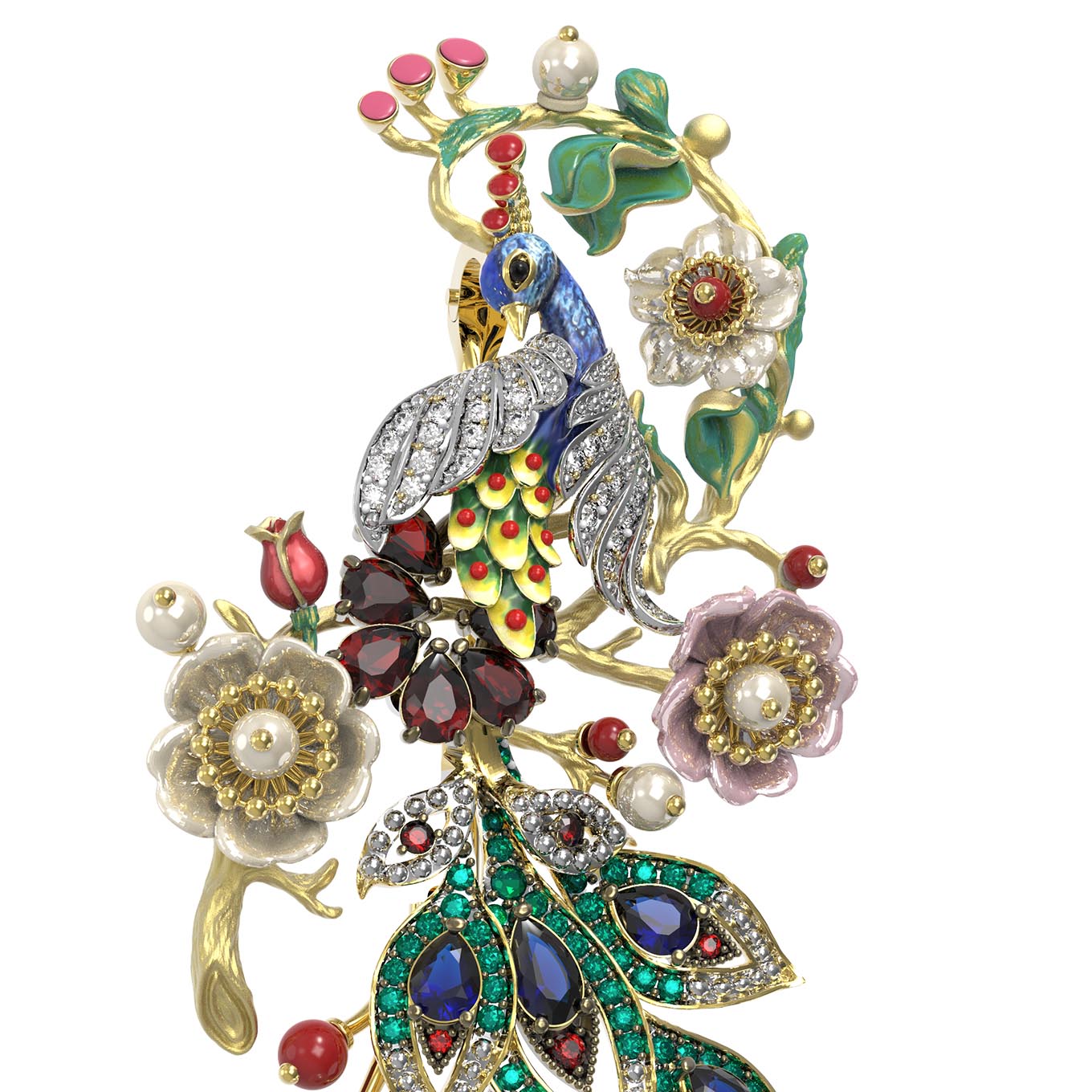 Брошь из лимонного золота c эмалью, фианитом, гранатом, жемчугом, сапфиром, кораллом и перламутром