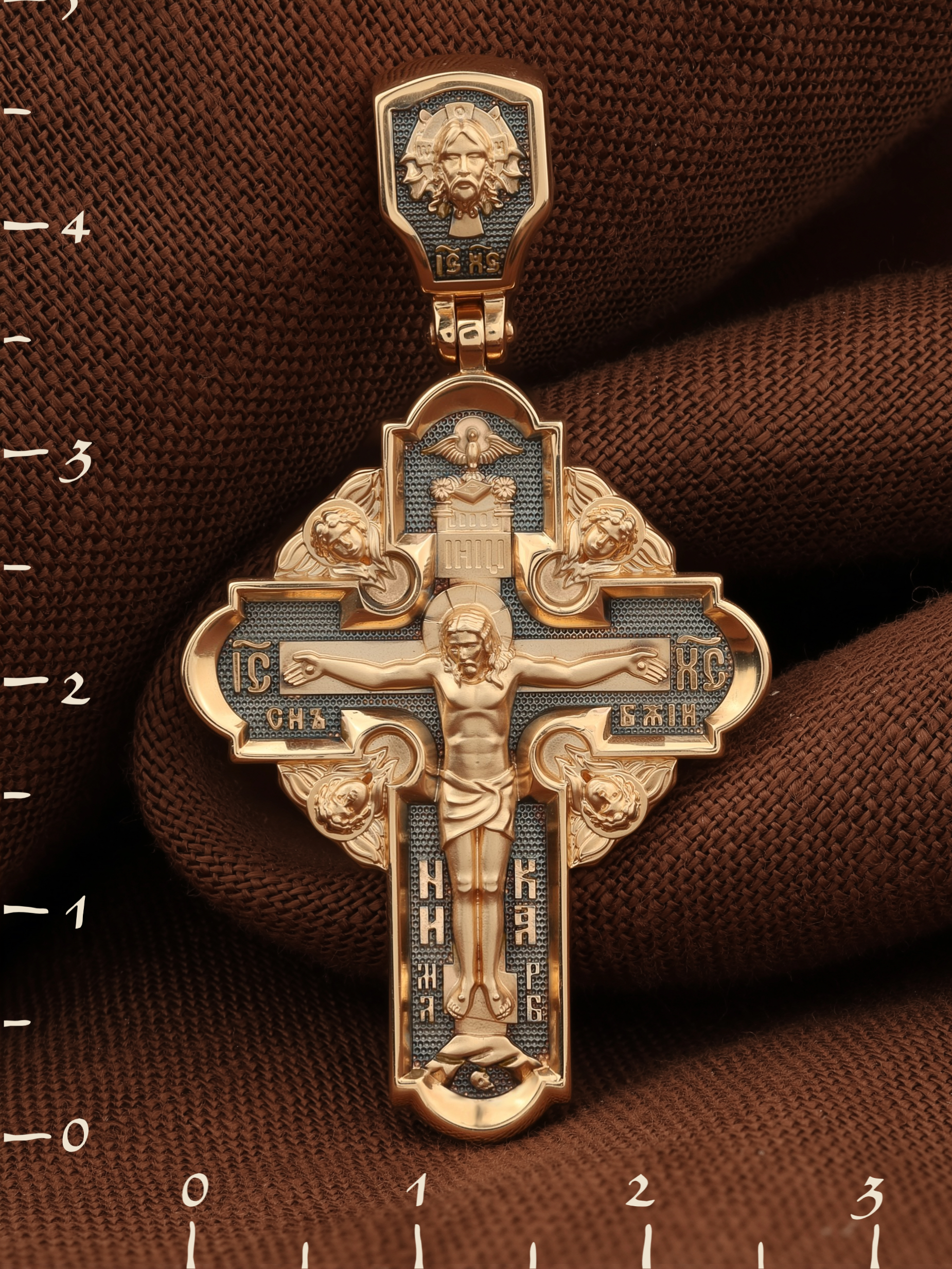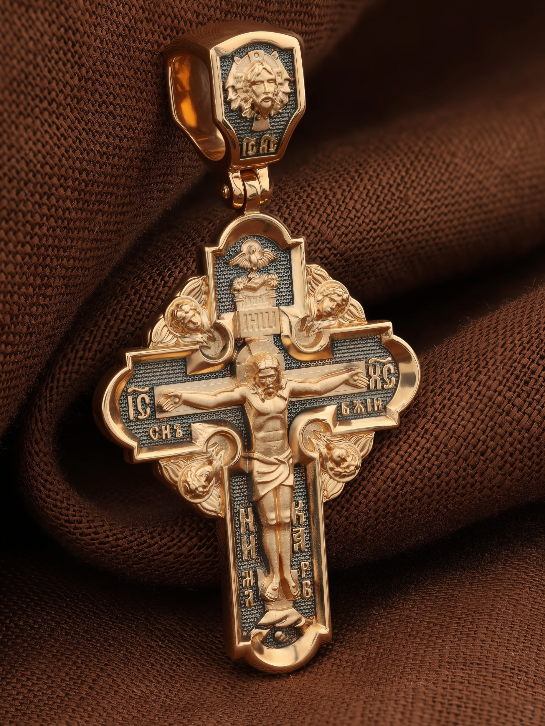 На лицевой стороне креста изображено Распятие Господа и Спасителя нашего Иисуса Христа. Крест- символ спасения и искупления рода человеческого, знамение победы над смертью и адом. Верхняя перекладина символизирует титло — табличку, на которой, согласно Евангелию, было начертано: Иисус Назорей Царь Иудейский (IНЦI). Надпись «IC» «ХC», означает Иисус Христос, помещается на разных сторонах поперечной перекладины креста. Ниже перекладины расположено словосочетание «СЫН БОЖИЙ», что означает божественную природу Иисуса Христа. Надпись «МЛРБ» — «место лобное рай бысть» означает, что место лобное стало раем и помещаются в нижней части креста. Рядом — слово «НИКА», что означает «победитель». Возвышение, на котором стоит Крест, символизирует гору Голгофу, на которой произошло Распятие. Под подножием Креста изображена покоящаяся голова (череп) Адама. На кулонном кольце изображен Нерукотворный образ Господа и Спасителя нашего Иисуса Христа, чудесно отпечатавшийся на плате, которым Христос вытер свой лик.