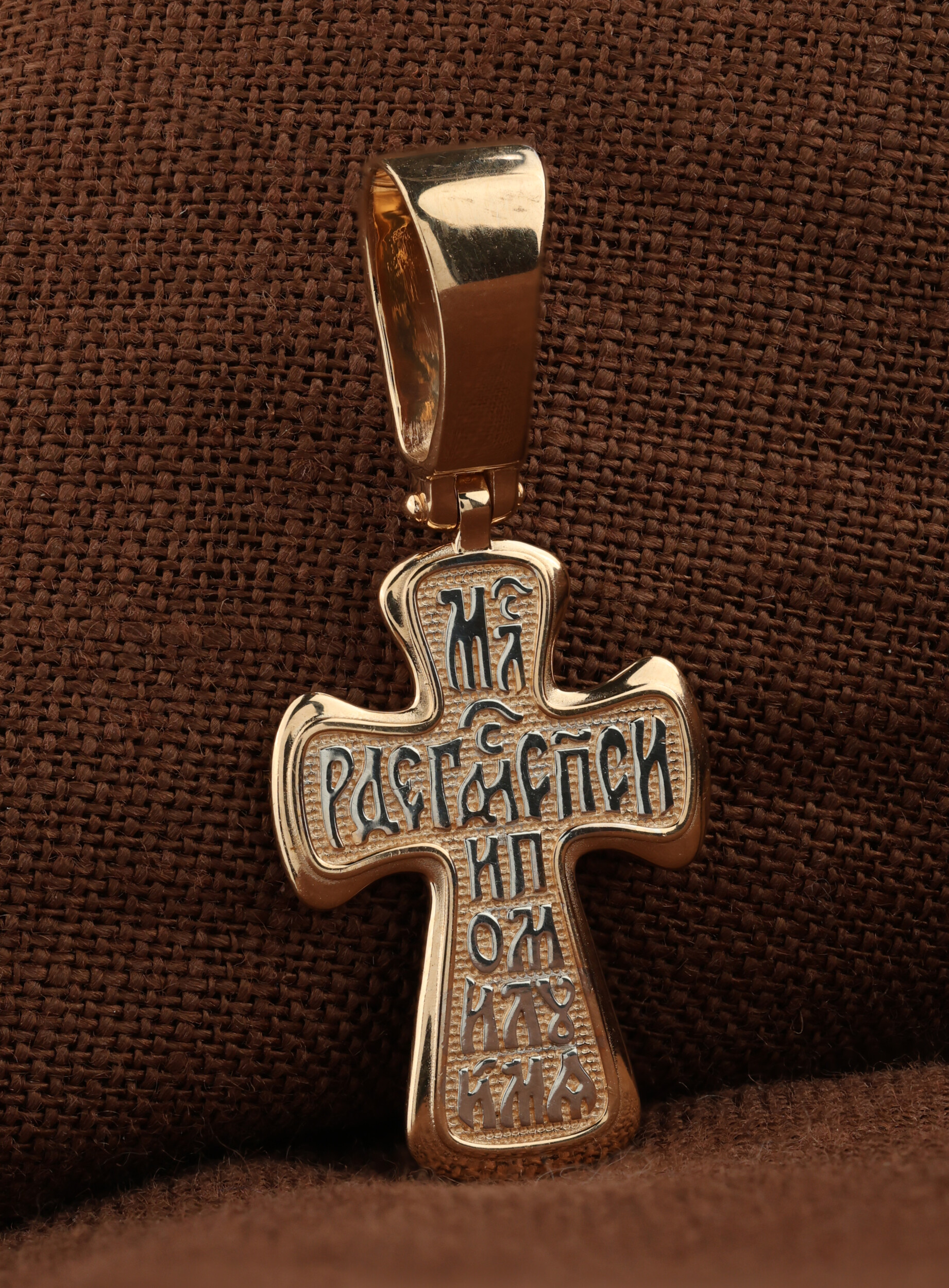 На лицевой стороне креста изображено Распятие, потому что это орудие казни Иисус Христос сделал орудием победы над грехом и смертью. Своими страданиями Он искупил грехи человечества, умерев и сошествовав во ад, победил сатану, освободил души праведников от вечной смерти и открыл им небесные врата рая. Жертва Христа сделала возможным спасение для каждого человека. На православном кресте Христос не умирает, а свободно простирает руки, ладони Иисуса открыты, будто он хочет обнять все человечество, даря им свою любовь и открывая путь к вечной жизни. Над титлом видим слова «ЦРЬ СЛВЫ» — Царь Славы. Верхняя перекладина символизирует собой табличку с надписью «IHЦI» — Иисус Назарянин Царь Иудейский. Возле перекладины пишется сокращенно имя Спасителя «IC XC» — Иисус Христос, ниже перекладины добавляется: словосочетание «СНЪ БЖІЙ» — Сын Божий и «НИКА» (греч. — Победитель). Возвышение, на котором стоит Крест, символизирует гору Голгофу, на которой произошло Распятие. У подножия Креста изображают прах Адама, обозначенный черепом.