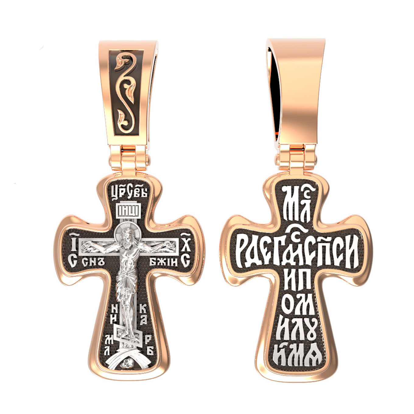 На лицевой стороне креста изображено Распятие, потому что это орудие казни Иисус Христос сделал орудием победы над грехом и смертью. Своими страданиями Он искупил грехи человечества, умерев и сошествовав во ад, победил сатану, освободил души праведников от вечной смерти и открыл им небесные врата рая. Жертва Христа сделала возможным спасение для каждого человека. На православном кресте Христос не умирает, а свободно простирает руки, ладони Иисуса открыты, будто он хочет обнять все человечество, даря им свою любовь и открывая путь к вечной жизни. Над титлом видим слова «ЦРЬ СЛВЫ» — Царь Славы. Верхняя перекладина символизирует собой табличку с надписью «IHЦI» — Иисус Назарянин Царь Иудейский. Возле перекладины пишется сокращенно имя Спасителя «IC XC» — Иисус Христос, ниже перекладины добавляется: словосочетание «СНЪ БЖІЙ» — Сын Божий и «НИКА» (греч. — Победитель). Возвышение, на котором стоит Крест, символизирует гору Голгофу, на которой произошло Распятие. У подножия Креста изображают прах Адама, обозначенный черепом.