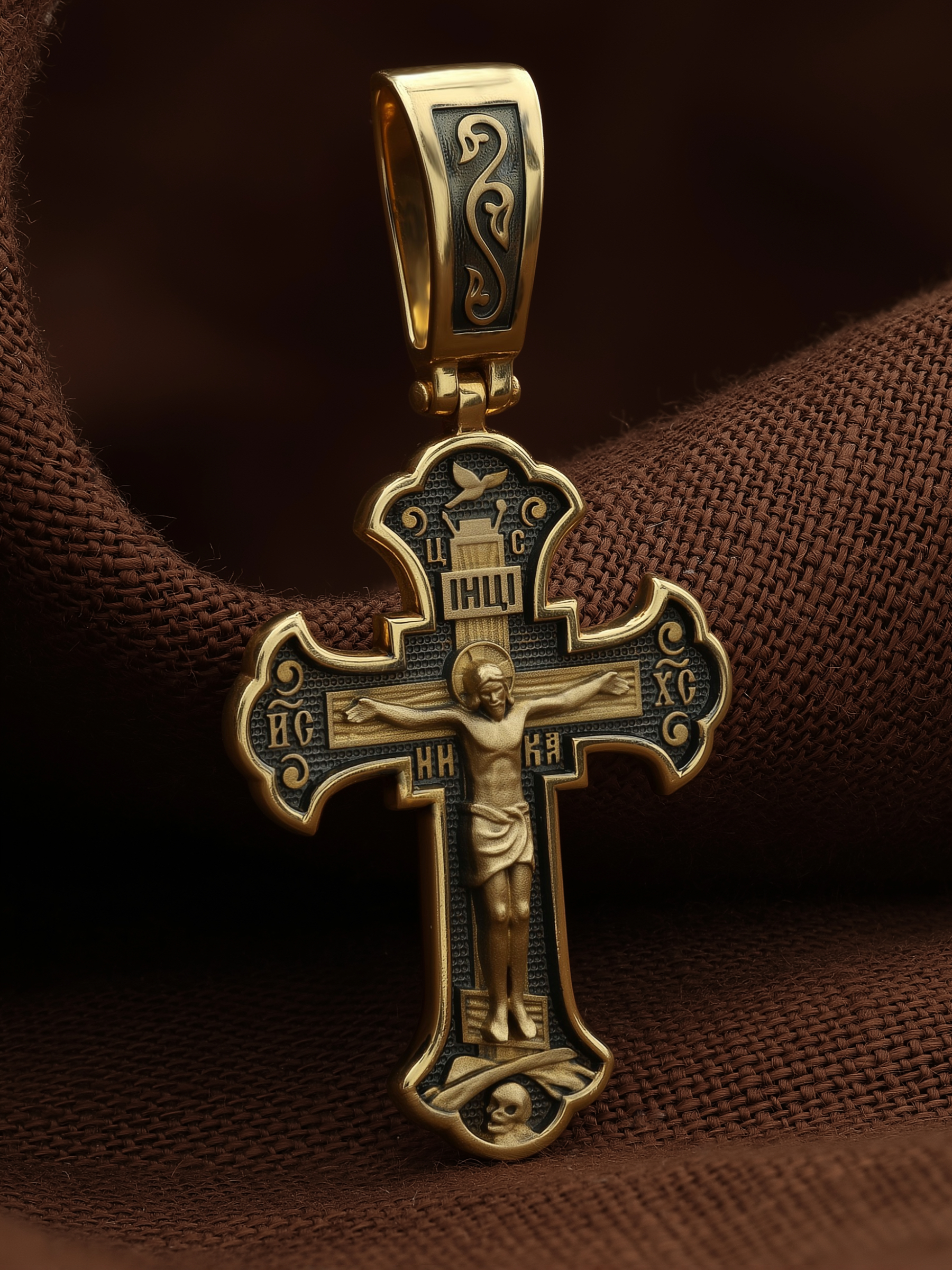 Над титлом помещена аббревиатура «ЦС» (Царь Славы). Верхняя перекладина символизирует собой табличку с надписью «IHЦI» — Иисус Назарянин Царь Иудейский. Возле перекладины пишется сокращенно имя Спасителя «IC XC» — Иисус Христос, ниже перекладины добавляется: «НИКА» (греч. — Победитель). Возвышение, на котором стоит Крест, символизирует гору Голгофу, на которой произошло Распятие. У подножия Креста изображают прах Адама, обозначенный черепом.