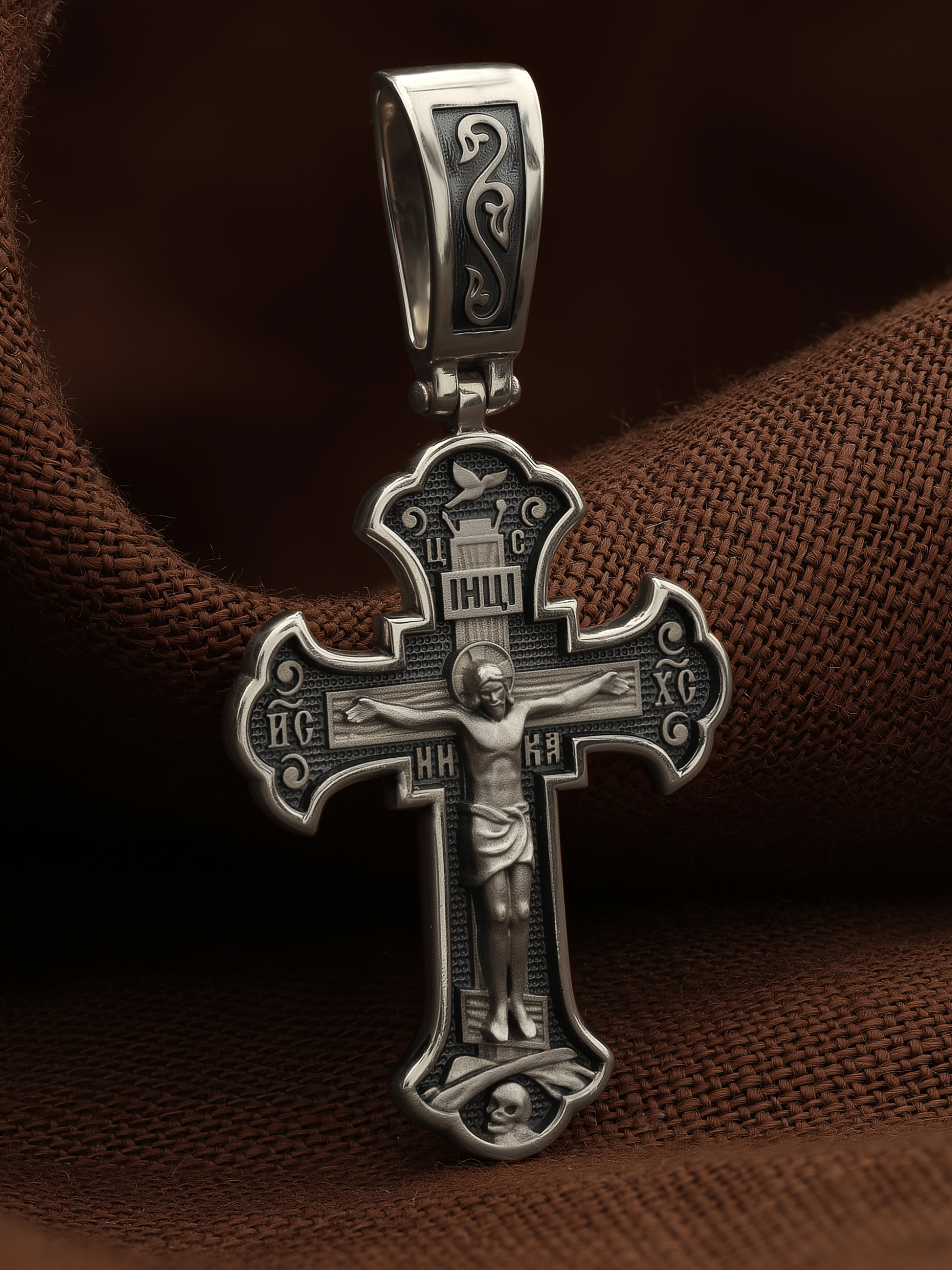 На лицевой стороне креста изображено Распятие, потому что это орудие казни Иисус Христос сделал орудием победы над грехом и смертью. Своими страданиями Он искупил грехи человечества, умерев и сошествовав во ад, победил сатану, освободил души праведников от вечной смерти и открыл им небесные врата рая. Жертва Христа сделала возможным спасение для каждого человека. На православном кресте Христос не умирает, а свободно простирает руки, ладони Иисуса открыты, будто он хочет обнять все человечество, даря им свою любовь и открывая путь к вечной жизни.