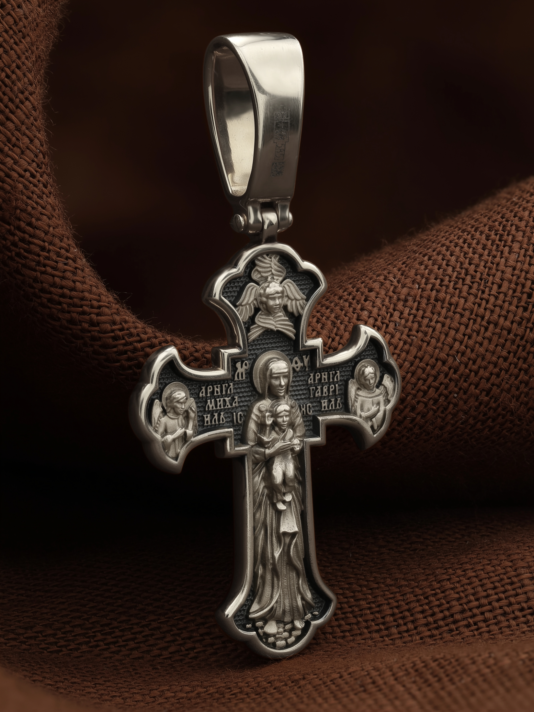 На обратной стороне креста в полный рост изображена Валаамская икона Божией Матери, над которой раскрыл свои крылья серафим. Этот образ написал в 1878 году иеромонах Валаамского монастыря о. Алипий. Валаамскую икону прославили многие чудеса, ее считают целительницей при разных недугах. Перед этим образом Богородицу молят в первую очередь об укреплении веры, просят даровать смирение, твердость в соблюдении заповедей Христовых и об исцелении. Богородице предстоят два архангела, Михаил и Гавриил.