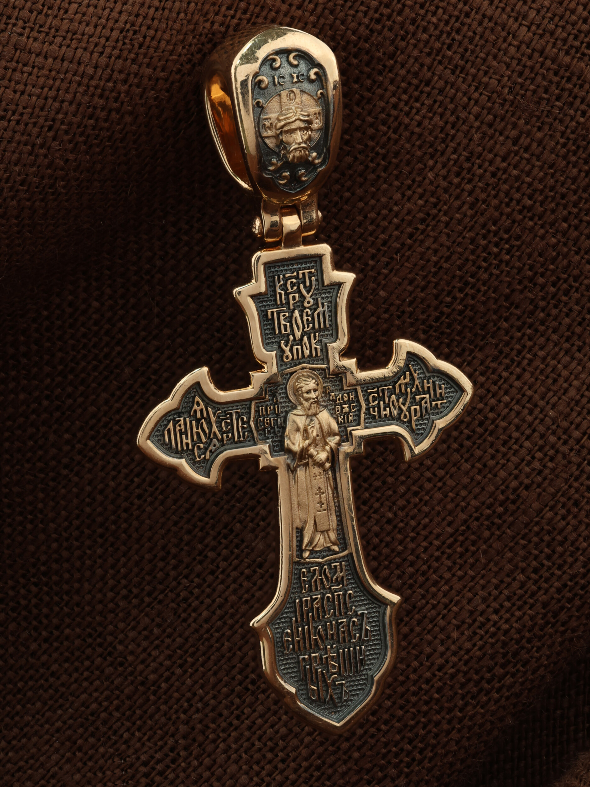 На лицевой стороне этого креста центральную часть занимает икона Распятия Христа — образ жертвы, принесенной Господом за грехи людей. Над титлом видим слова «ЦРЬ СЛВЫ» — Царь Славы. Верхняя перекладина символизирует собой табличку с надписью «IHЦI» — Иисус Назарянин Царь Иудейский. Возле перекладины пишется сокращенно имя Спасителя «IC XC» — Иисус Христос. У подножия мы видим четыре буквы «МЛ» «РБ» — Место Лобное Рай Бысть. Возвышение, на котором стоит Крест, символизирует гору Голгофу, на которой произошло Распятие. У подножия Креста изображают прах Адама, обозначенный черепом. На кулонном кольце изображен шестикрылый Серафим — самый приближенный к Господу Ангел.