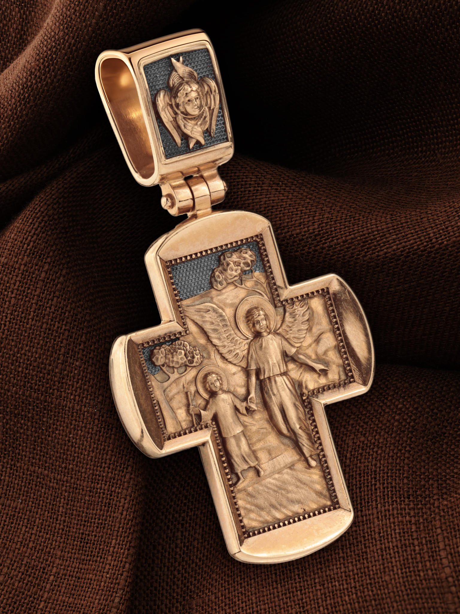 На оборотной стороне креста изображен святой Ангел-Хранитель, ведущий человеческую душу, которая представлена в виде ребёнка. Ангел-Хранитель — это Ангел приставляемый Богом к человеку при крещении для охраны и помощи в добрых делах. Он невидимо находится при человеке на протяжении всей его жизни, если человек сохраняет в себе любовь к Богу и истинную веру перед Ним. Ангел-Xранитель делают для нас все, что служит к истинному нашему благу и спасению. Невидимо пребывая при нас постоянно, он, руководствуя нас ко спасению, не только по нашему желанию таинственно наставляет нас на все доброе и полезное, не только возносит наши молитвы к Богу, но еще и сам от себя охраняют и защищают нас от врагов видимых и невидимых и ходатайствует за нас пред Богом. Одного лишь каждому из нас он желает — спасения души; к этому он направляет все свои заботы. И если видит нас также заботящимися о спасении, радуется, если же видит нас пребывающими в нерадении о душе своей, скорбит. Но и самый великий грешник может примириться со своим Ангелом-Хранителем посредством искреннего раскаяния в грехах и оставления их навсегда. В таком случае, по слову Писания, великая радость бывает для всех ангелов на небесах (Лк. 15:10). На кулонном кольце изображен Серафим.