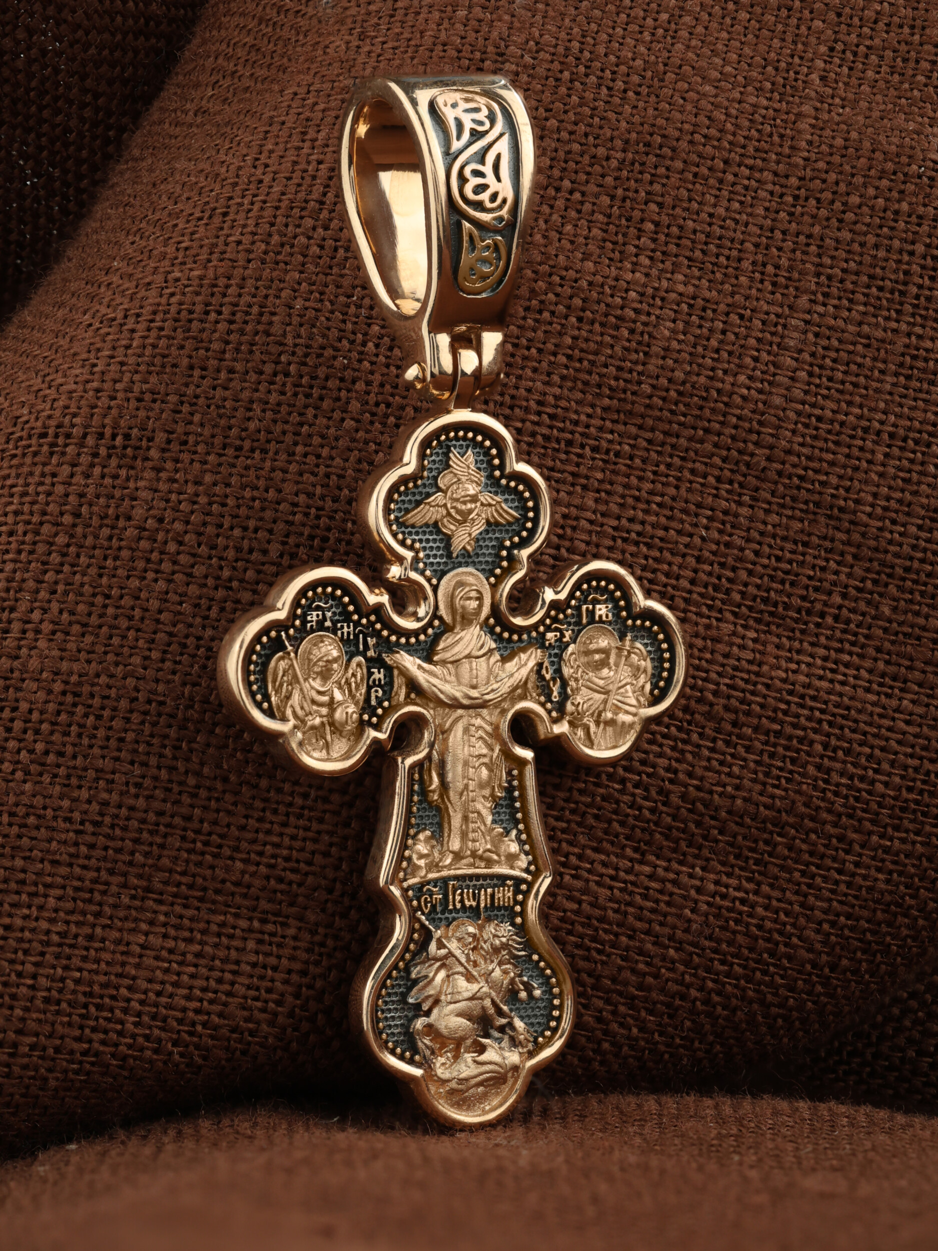 Центральную часть оборотной стороны креста украшает икона Божией Матери «Покров Пресвятой Богородицы». Праздник Покрова Пресвятой Богородицы пришел на Русь в XII веке из Византии и стал одним из самых почитаемых. Пресвятая Богородица простирает Свой молитвенный покров над всеми православными христианами и умоляет Сына своего о даровании вечного спасения каждому человеку. Над образом помещен шестикрылый Серафим. Справа помещено изображение Архангела Гавриила, слева- Архангела Михаила. На кресте внизу помещено изображение Святого Великомученика Георгия Победоносца — одного из самых почитаемых и удивительных святых. Он изображен как воитель, сидящий на вздыбленном коне и поражающий копьем огнедышащего змея. Змей символизирует собою сатанинские силы.