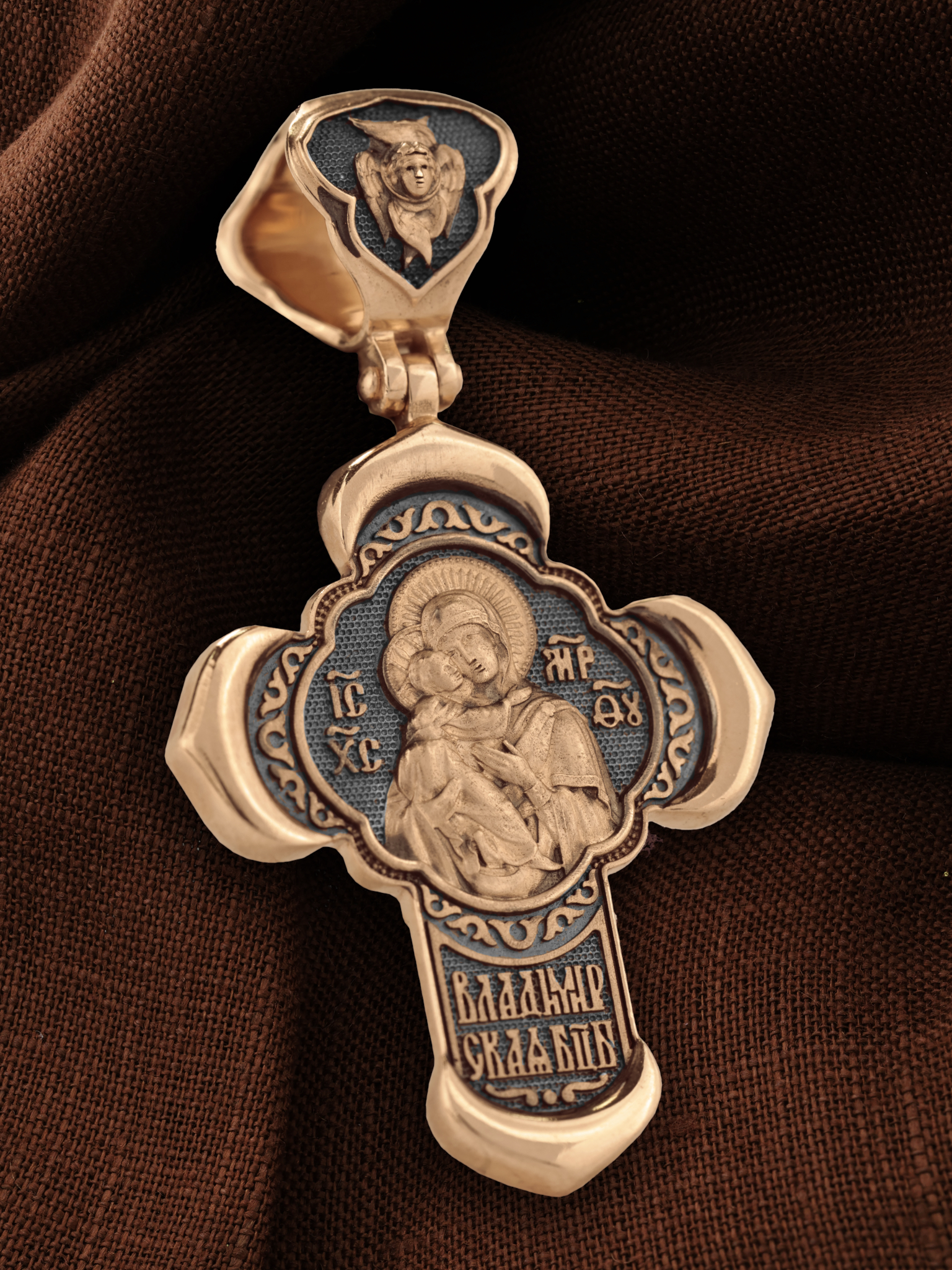 В центре оборотной стороне креста помещен образ Владимирской иконы Божией Матери — один из самых чтимых святынь Русской православной церкви. По преданию, икона была написана Святым апостолом и евангелистом Лукой во время земной жизни Богородицы. Икона Владимирской Божией Матери вплоть до V века находилась в Иерусалиме, затем была перевезена в Византию. На Русь икона была привезена в 1131 г. За прошедшие столетия святыня неоднократно переезжала из Владимира в Москву и обратно, не раз спасая страну от захватчиков. Русская Православная Церковь установила троекратное празднование Владимирской иконе Божией Матери. Каждый из дней празднования связан с избавлением русского народа от порабощения иноплеменниками по молитвам ко Пресвятой Богородице