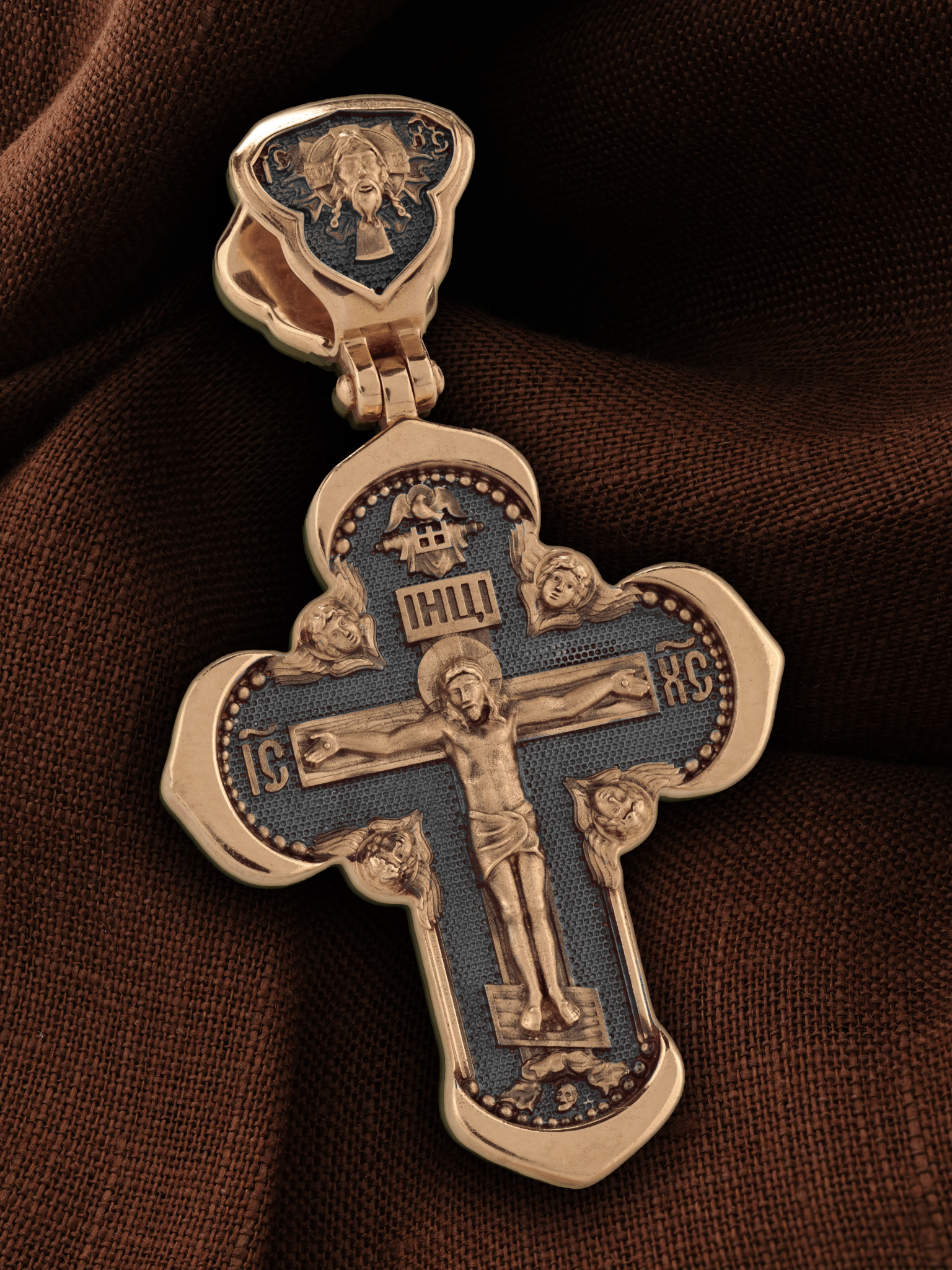 На лицевой стороне креста изображено Распятие Господа и Спасителя нашего Иисуса Христа, отдавшего Себя на смерть, для искупления грехов мира. Крест является символом жертвенной любви Всеблагого Бога к падшим людям, всепобеждающим духовным оружием христиан, основанием и средоточием церковной жизни. Господь сказал: «кто хочет идти за Мною, отвергнись себя, и возьми крест свой, и следуй за Мною». (Мк. 8: 34). На верхней табличке, выше головы Иисуса, расположена надпись, составленная Понтием Пилатом — «IНЦI». Она означает «Иисус Назорей, Царь Иудейский». Надпись «IC» «ХC», означает Иисус Христос, помещается на разных сторонах поперечной перекладины креста. Крест стоит на горе камней, символизирующих Голгофу. В ее основании различается череп– это голова Адама. На кулонном кольце изображен Нерукотворный образ Господа и Спасителя нашего Иисуса Христа, чудесно отпечатавшийся на плате, которым Христос вытер свой лик.
