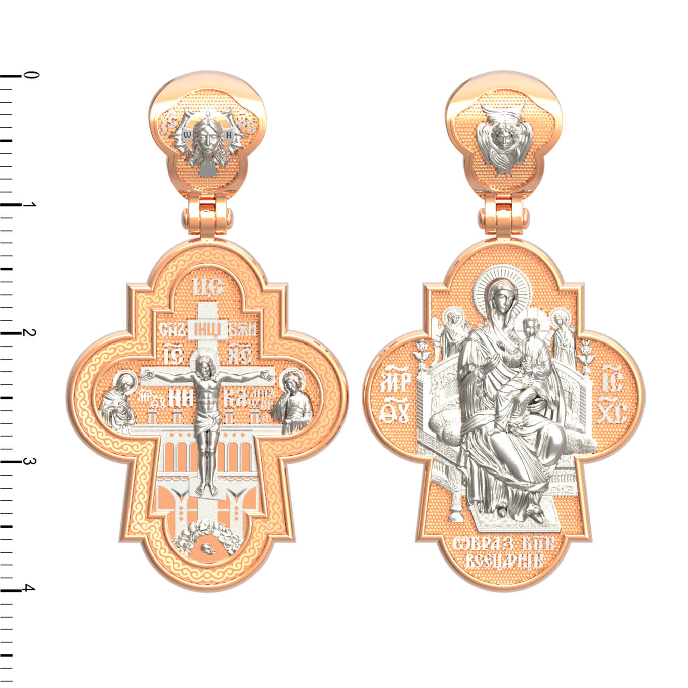 На оборотной стороне креста изображена икона Божией Матери «Всецарица» или «Пантанасса», на которой Пресвятая Богородица восседает на царском троне. На руках Ее — Богомладенец Христос со свитком в левой руке и благословляющий десницей. Правой рукой Богородица указывает на Своего Царственного Сына, как на Спасителя мира. Чудотворная икона была написана в XVII веке и находится на Святой Горе Афон, в одном из древних греческих монастырей — Ватопеде. По молитвам перед иконой совершается множество чудесных исцелений. Пречистая Богородица наставляет на праведный путь, помогает укрепить веру, найти утешение. На кулонном кольце изображен шестикрылый Серафим.