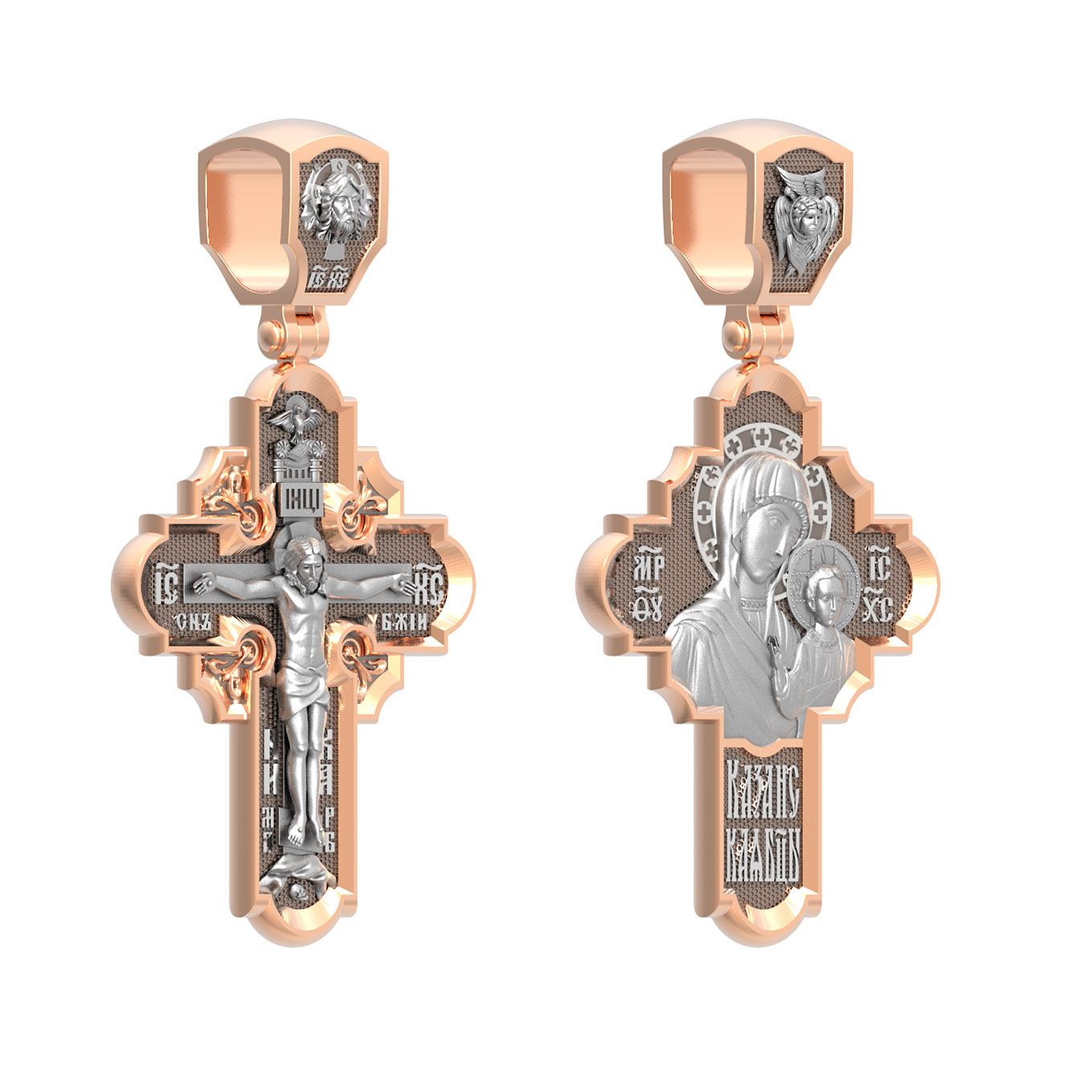 На оборотной стороне креста изображена Казанская икона Божией Матери. Пресвятая Богородица — милосердная заступница, просительница за нас перед Богом. Она стала воистину нашей Матушкой, охраняющей и поддерживающей нас от рождения до самой смерти, а Ее благодатная помощь изливается на нас по молитвам у ее чудотворных икон. Казанская икона явилась в 1579 году в Казани, вскоре после взятия Казанского царства у татар Иоанном Грозным. Этот образ Богородицы не раз сопровождал русский народ в бедствиях. Икона Божией Матери Казанская вдохновляла русских ратников в период Смутного времени при освобождении Москвы от поляков. Перед Казанской иконой в 1709 году, накануне Полтавской победы, император Петр I молился о даровании победы русскому войску. В 1812 году накануне отъезда в действующую армию перед чудотворной иконой Божией Матери молился князь Михаил Кутузов. Не только государственным мужам и дружинам указывала путь икона — по доброй традиции именно этой иконой благословляют на брак молодых родители, длинным списком чудес сопровождается этот образ Богоматери — один из самых любимых на Руси. Существует множество древних списков с этой удивительной иконы.