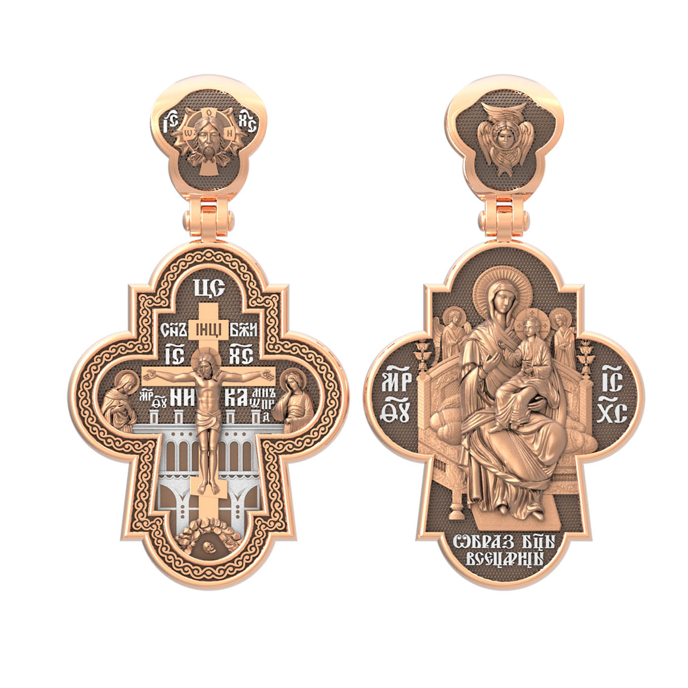 На оборотной стороне креста изображена икона Божией Матери «Всецарица» или «Пантанасса», на которой Пресвятая Богородица восседает на царском троне. На руках Ее — Богомладенец Христос со свитком в левой руке и благословляющий десницей. Правой рукой Богородица указывает на Своего Царственного Сына, как на Спасителя мира. Чудотворная икона была написана в XVII веке и находится на Святой Горе Афон, в одном из древних греческих монастырей — Ватопеде. По молитвам перед иконой совершается множество чудесных исцелений. Пречистая Богородица наставляет на праведный путь, помогает укрепить веру, найти утешение. На кулонном кольце изображен шестикрылый Серафим.