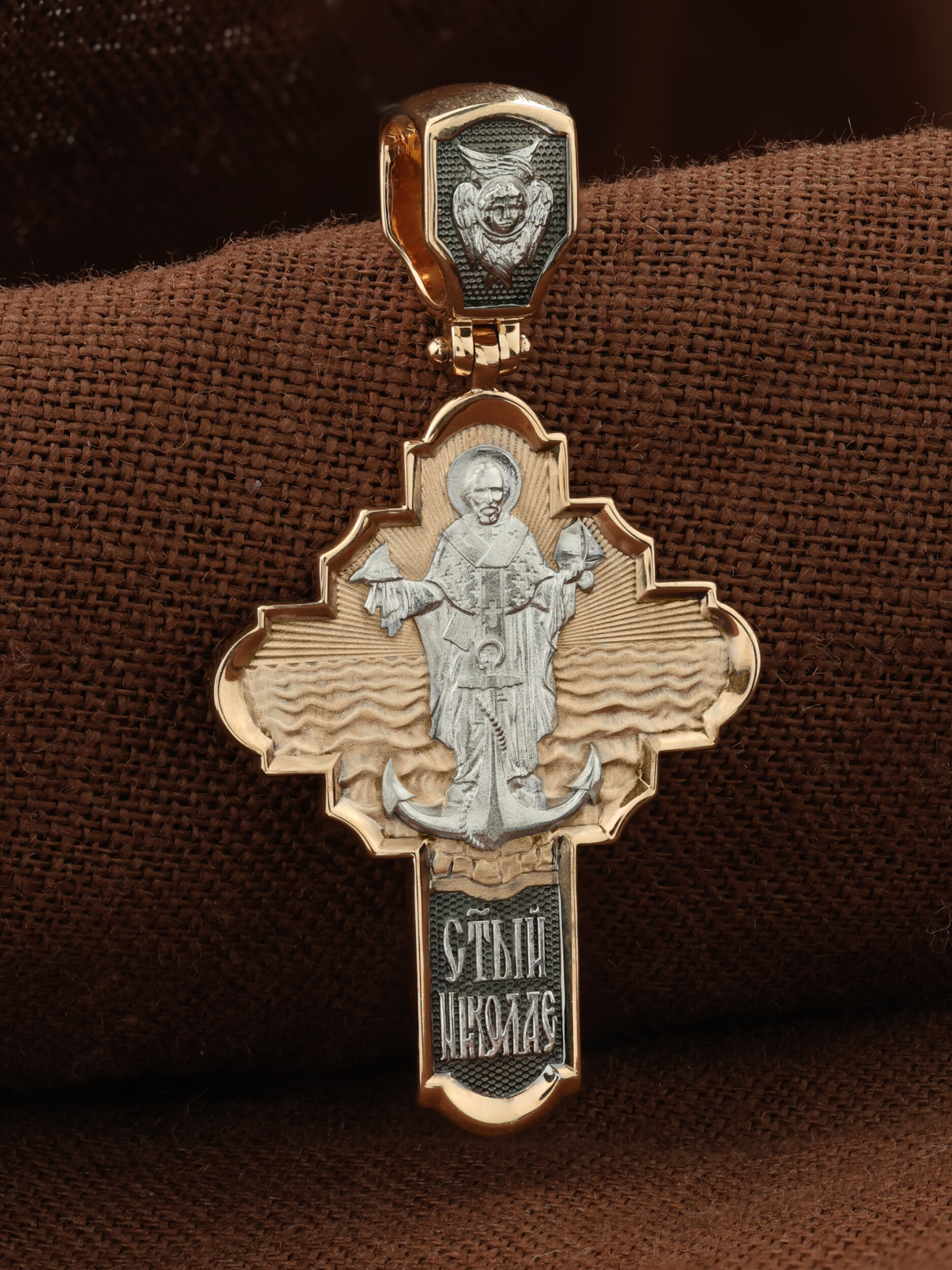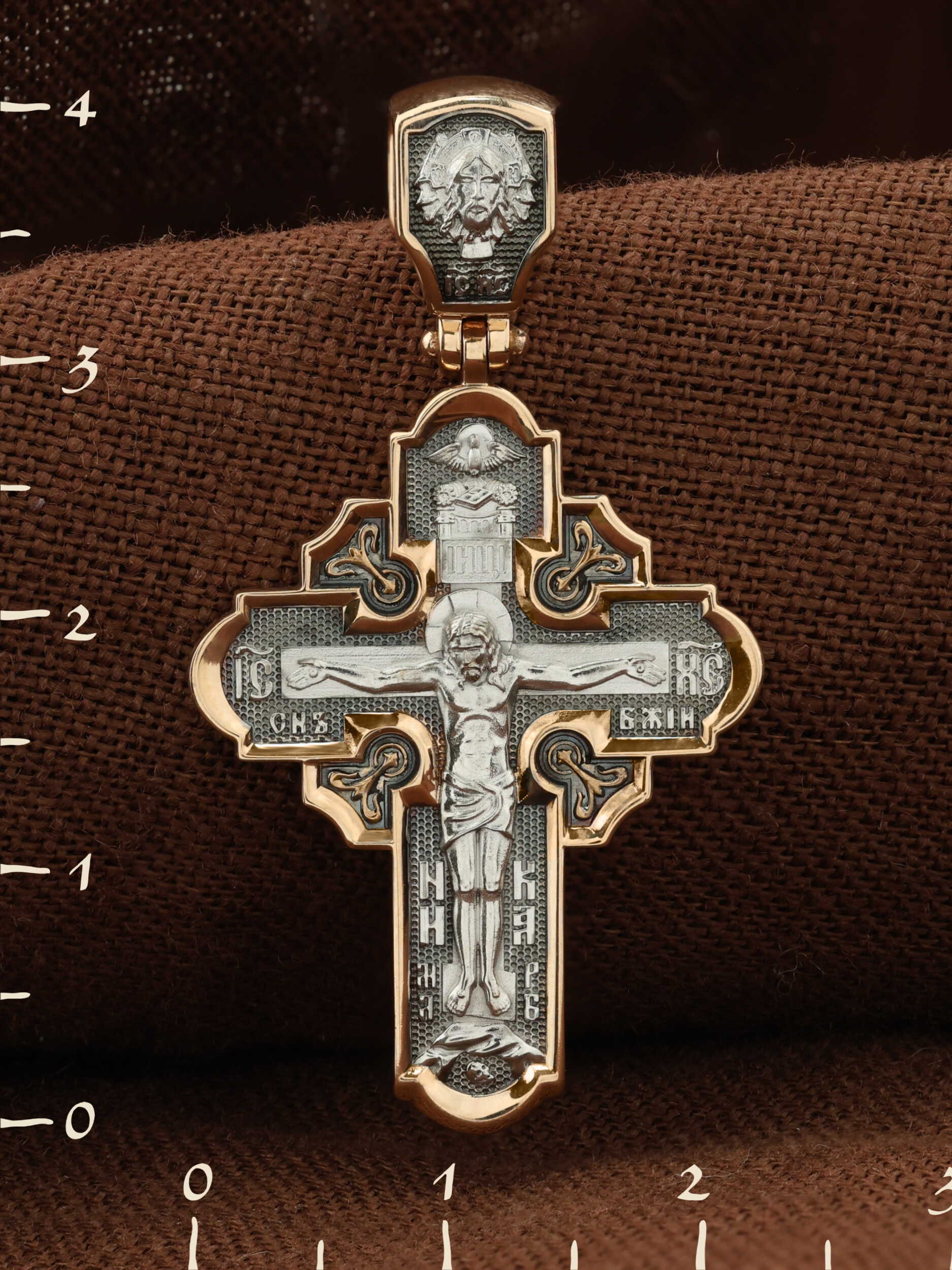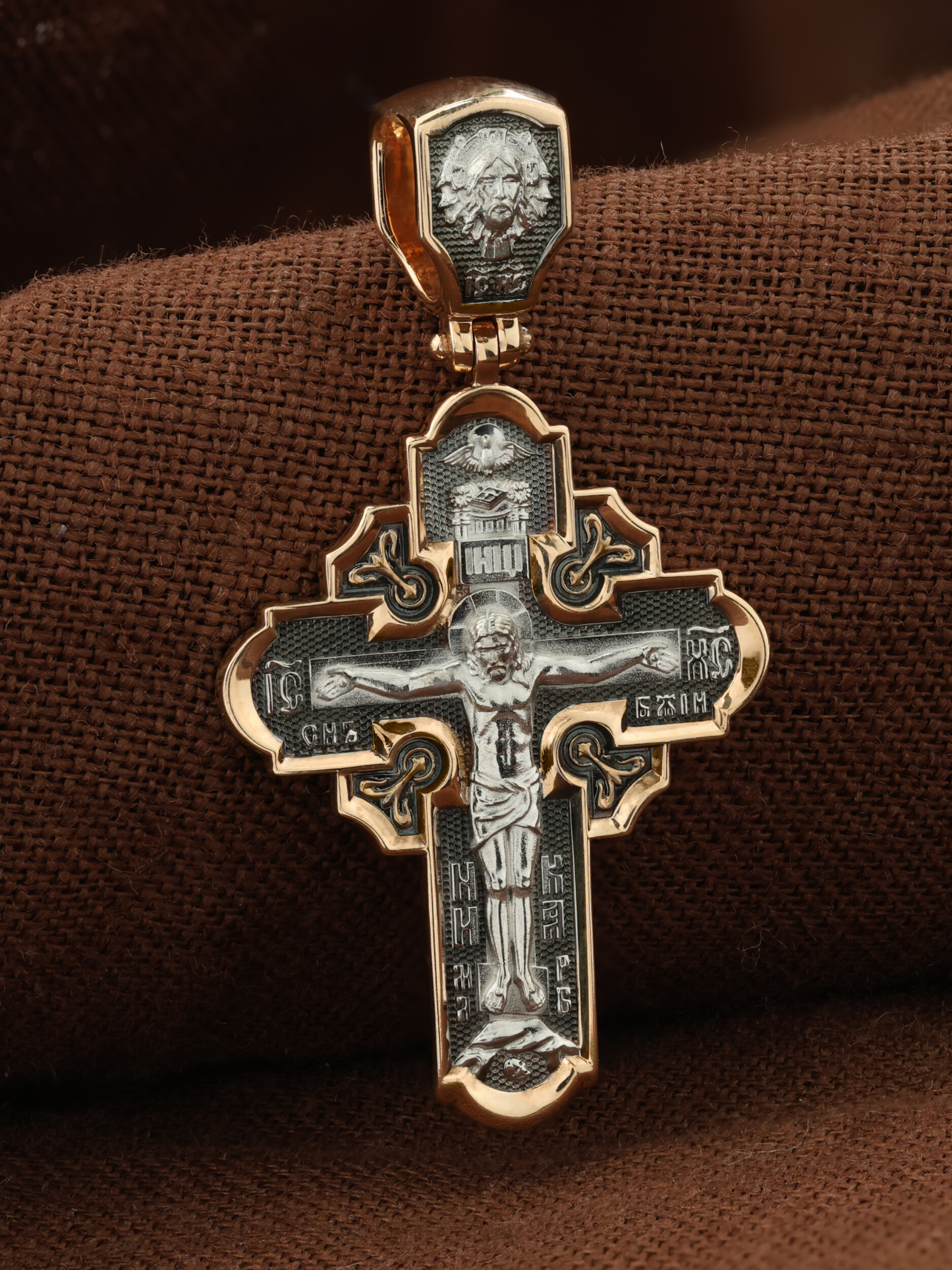 На лицевой стороне креста изображено Распятие Господа и Спасителя нашего Иисуса Христа, отдавшего Себя на смерть, чтобы другие могли жить — жить вечной жизнью, жить с Богом. Своею кровью Господь освятил крест и сделал его проводником Своей благодати, источником освящения верующих. На верхней табличке, выше головы Иисуса, расположена надпись, составленная Понтием Пилатом — «ИНЦИ». Она означает «Иисус Назорей, Царь Иудейский». Надпись «IС ХС» означает Иисус Христос помещается на разных сторонах поперечной (большой) перекладины креста. На кулонном кольце помещено изображение Духа Святого в виде голубя, сходящего с Небес