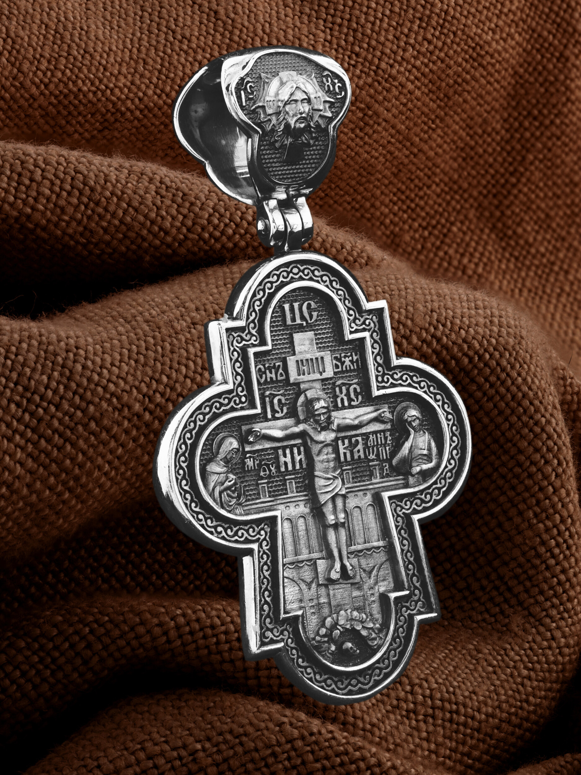 На лицевой стороне креста изображено Распятие Господа и Спасителя нашего Иисуса Христа, отдавшего Себя на смерть, для искупления грехов мира. Крест является символом жертвенной любви Всеблагого Бога к падшим людям, всепобеждающим духовным оружием христиан, основанием и средоточием церковной жизни. Господь сказал: кто хочет идти за Мною, отвергнись себя, и возьми крест свой, и следуй за Мною. (Мк. 8: 34). Над Распятием помещена надпись «Царь Славы». На верхней табличке, выше головы Иисуса, расположена надпись, составленная Понтием Пилатом — «IНЦI». Она означает «Иисус Назорей, Царь Иудейский». Надпись «IC» «ХC», означает Иисус Христос, помещается на разных сторонах поперечной перекладины креста. Возвышение, на котором стоит Крест, символизирует гору Голгофу, на которой произошло Распятие. Под подножием Креста изображена покоящаяся голова (череп) Адама. На кулонном кольце изображен Нерукотворный образ Господа и Спасителя нашего Иисуса Христа, чудесно отпечатавшийся на плате, которым Христос вытер свой лик.