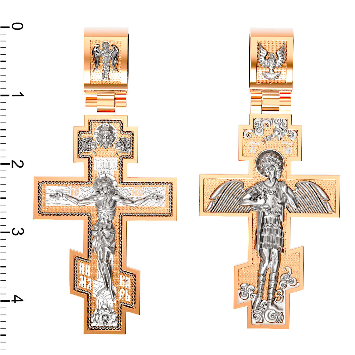 На оборотной стороне креста помещен Архангел Михаил, самый могущественный из ангелов. Это он низверг дьявола и встал во главе ангелов для борьбы с бесовскими силами. Его имя означает «Кто яко Бог?», так как он самый могучий и грозный враг зла. Древнерусские князья и воины стремились обрести покровительство Небесного Воеводы и нередко украшали свои шлемы его крылатой фигурой. На Руси также верили, что Архангел Михаил, как непримиримый враг дьявола, защищает и души умерших от бесовских нападений, провожая их на Небеса. Поэтому ему часто посвящались кладбищенские церкви.