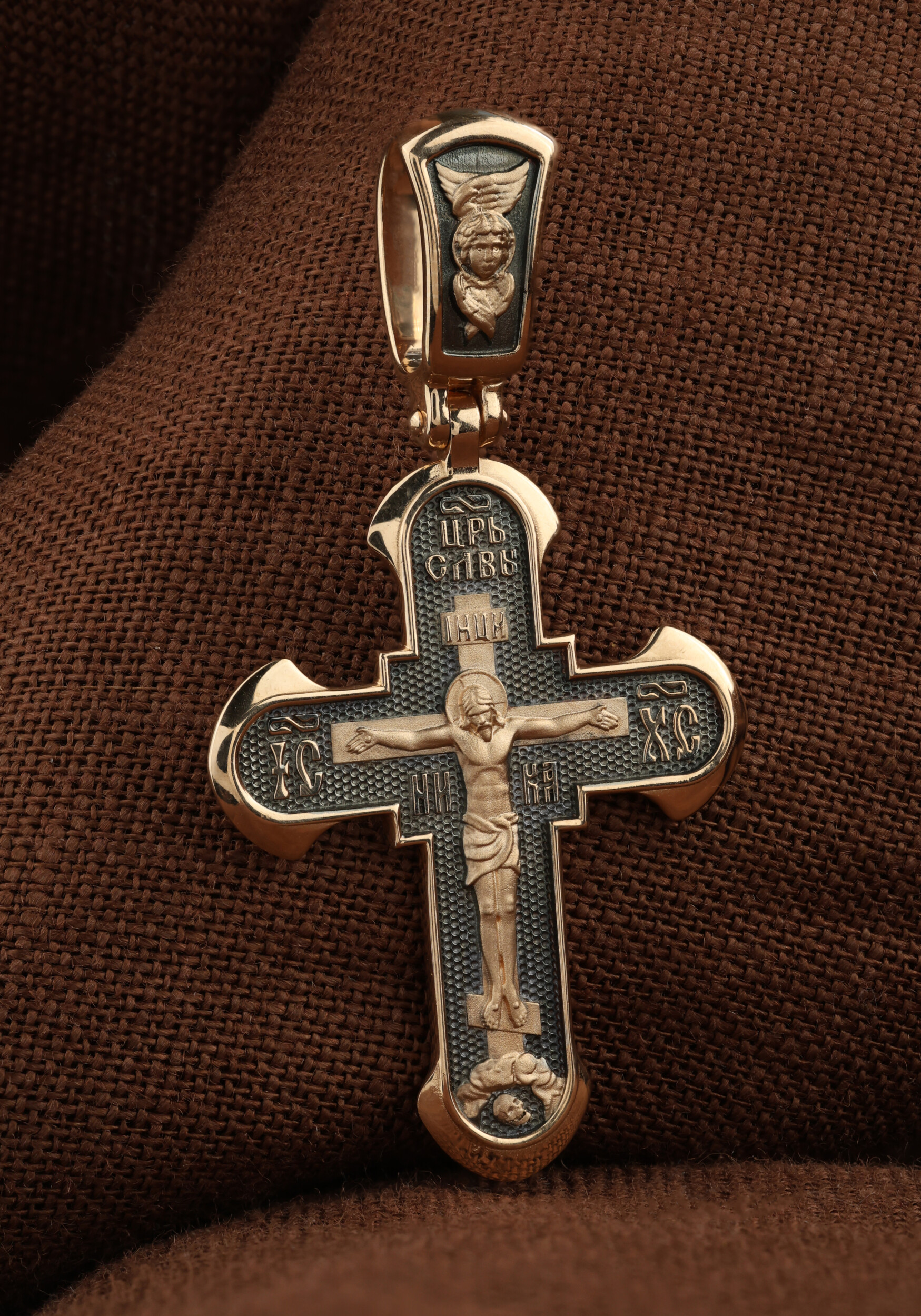 На лицевой стороне креста изображено Распятие Господа нашего Иисуса Христа. В традиции Православия — принято изображать Спасителя как Воскресшего Крестоносителя, призывающего в Свои объятия все концы мира. Его руки имеют горизонтальное положение, открытые ладони пробиты гвоздями, голова наклонена вправо, вокруг головы крестчатый нимб. Крест стоит на горе камней, символизирующих Голгофу, в основании которой различается череп. Это голова Адама. По преданию, тело Адама было погребено Симом, сыном Ноя, на месте, где впоследствии возникла гора Голгофа. Над головой Господа на поперечной перекладине аббревиатура «IНЦI», что символизирует табличку, которая была прибита к Кресту, с надписью «Иисус Назорей Царь Иудейский». Этим иудеи хотели посмеяться над Христом, не зная, что распинают истинного Царя всех царей. По бокам поперечной перекладины титлы святого имени Христа «IC» (Иисус) «ХС» (Христос), и слово «НИКА», что в переводе с греческого означает «победитель». Венчает лицевую сторону креста надпись «Царь Славы».