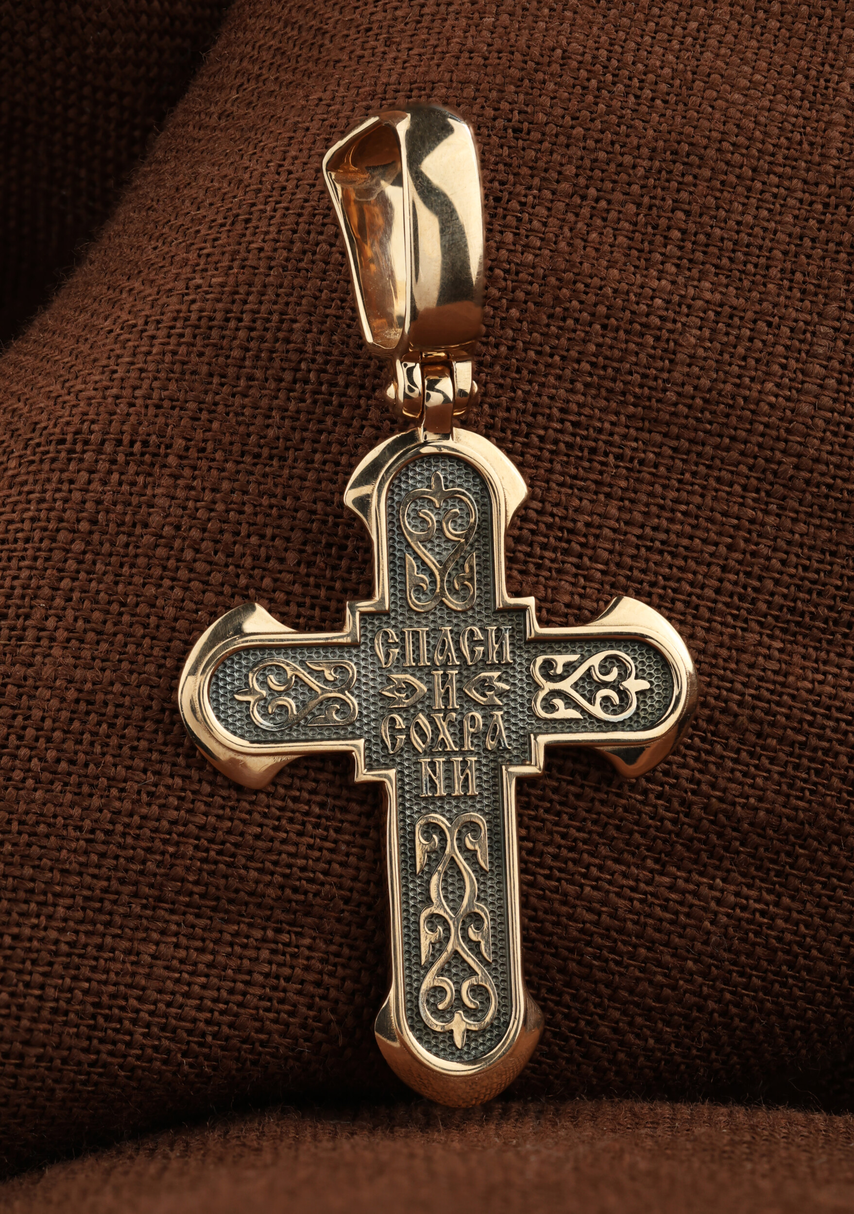 Обратная сторона креста выполнена с использованием растительного орнамента. Такой крест с растительным узором вводит мотив процветшего креста и символизирует Древо Жизни. Умерев за наши грехи, Христос возродил всех для Жизни Вечной, «Смертию смерть поправ…». Своими страданиями Он искупил грехи человечества, умерев и сошествовав во ад, победил сатану, освободил души праведников от вечной смерти и открыл им небесные врата рая. Поэтому на обороте данного креста написано молитвенное славословие: «Спаси и сохрани».