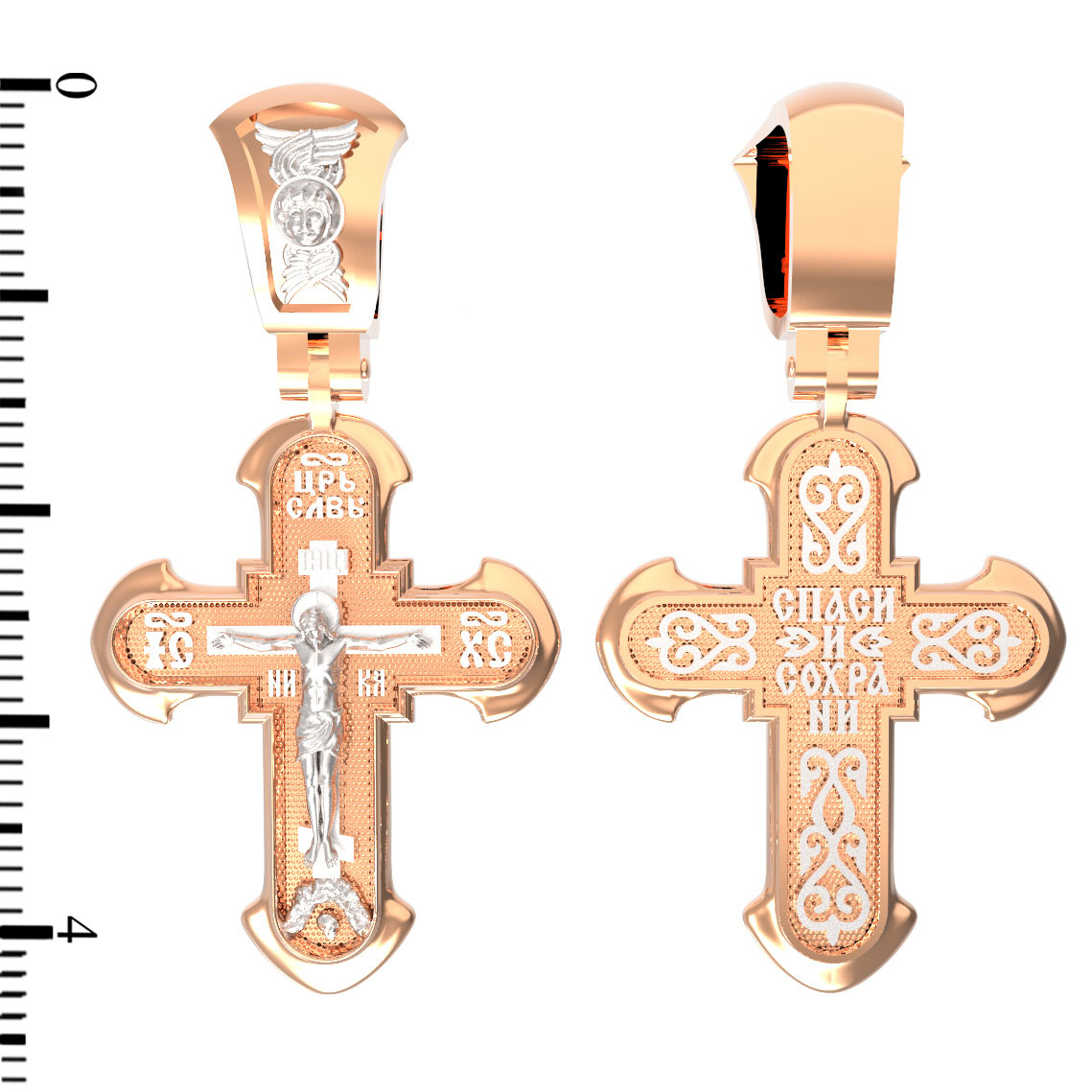 На лицевой стороне креста изображено Распятие Господа нашего Иисуса Христа. В традиции Православия — принято изображать Спасителя как Воскресшего Крестоносителя, призывающего в Свои объятия все концы мира. Его руки имеют горизонтальное положение, открытые ладони пробиты гвоздями, голова наклонена вправо, вокруг головы крестчатый нимб. Крест стоит на горе камней, символизирующих Голгофу, в основании которой различается череп. Это голова Адама. По преданию, тело Адама было погребено Симом, сыном Ноя, на месте, где впоследствии возникла гора Голгофа. Над головой Господа на поперечной перекладине аббревиатура «IНЦI», что символизирует табличку, которая была прибита к Кресту, с надписью «Иисус Назорей Царь Иудейский». Этим иудеи хотели посмеяться над Христом, не зная, что распинают истинного Царя всех царей. По бокам поперечной перекладины титлы святого имени Христа «IC» (Иисус) «ХС» (Христос), и слово «НИКА», что в переводе с греческого означает «победитель». Венчает лицевую сторону креста надпись «Царь Славы».