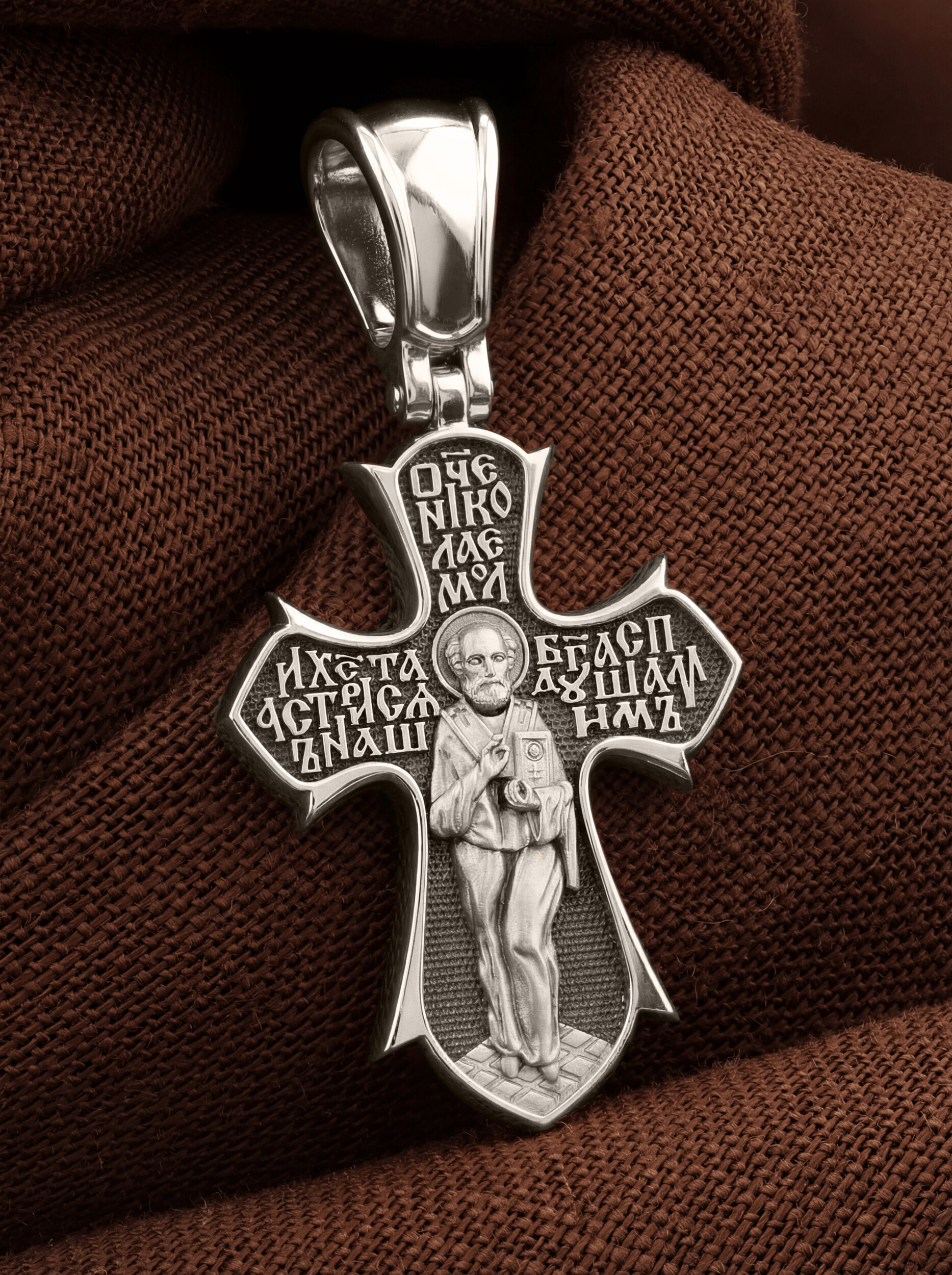 На лицевой стороне креста изображено распятие Господа нашего Иисуса Христа. Позади Распятия видна иерусалимская стена, знак того, что Господь был распят вне стен города. Но вместе с тем стена символизирует и Небесный Иерусалим, путь который открылся для человека через Голгофу. На кулоном кольце видим слова «ЦРЬ СЛВЫ» — Царь Славы. Верхняя перекладина символизирует собой табличку с надписью «IHЦI» — Иисус Назарянин Царь Иудейский. Над перекладиной пишется сокращенно имя Спасителя «IC XC» — Иисус Христос и словосочетание «СНЪ БЖIЙ» — «СЫН БОЖИЙ». Рядом с образом Христа помещены слова — «НИКА» (греч. — Победитель). Возвышение, на котором стоит Крест, символизирует гору Голгофу, на которой произошло Распятие. У подножия Креста изображают прах Адама, обозначенный черепом.