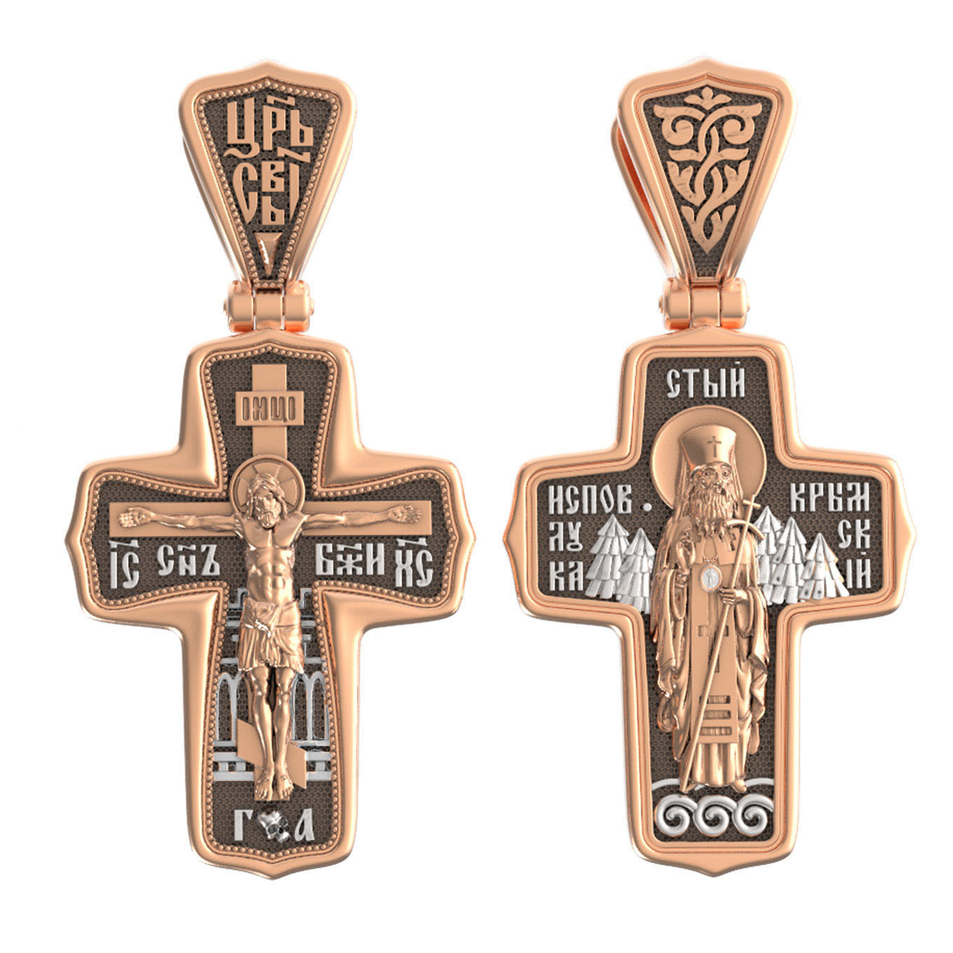 На оборотной стороне Креста помещен образ святителя Луки (Войно-Ясенецкого), архиепископа Симферопольского и Крымского, исповедника (1877–1961). Архиепископ Лука — русский святитель, исповедник, духовный писатель, доктор богословия, а также выдающийся ученый, автор трудов по анестезиологии, профессор хирургии, доктор медицинских наук, лауреат Сталинской премии. Он исповедовал веру Христову в гонениях, тюрьмах, лагерях и ссылке, пережил поношения и пытки, но остался верен Господу. Привел к православной вере тысячи и тысячи людей. Его почитание растет во всем православном мире. Неисчислимо количество свидетельств о чудесной помощи по молитвам к Святителю Луке. Архиепископ Лука советовал: «Главное в жизни — всегда делать людям добро. Если не можешь делать для людей добро большое, постарайся совершить хотя бы малое».
