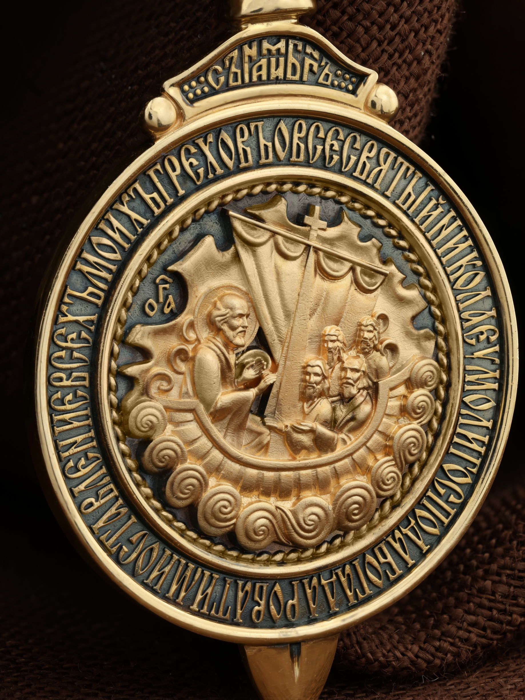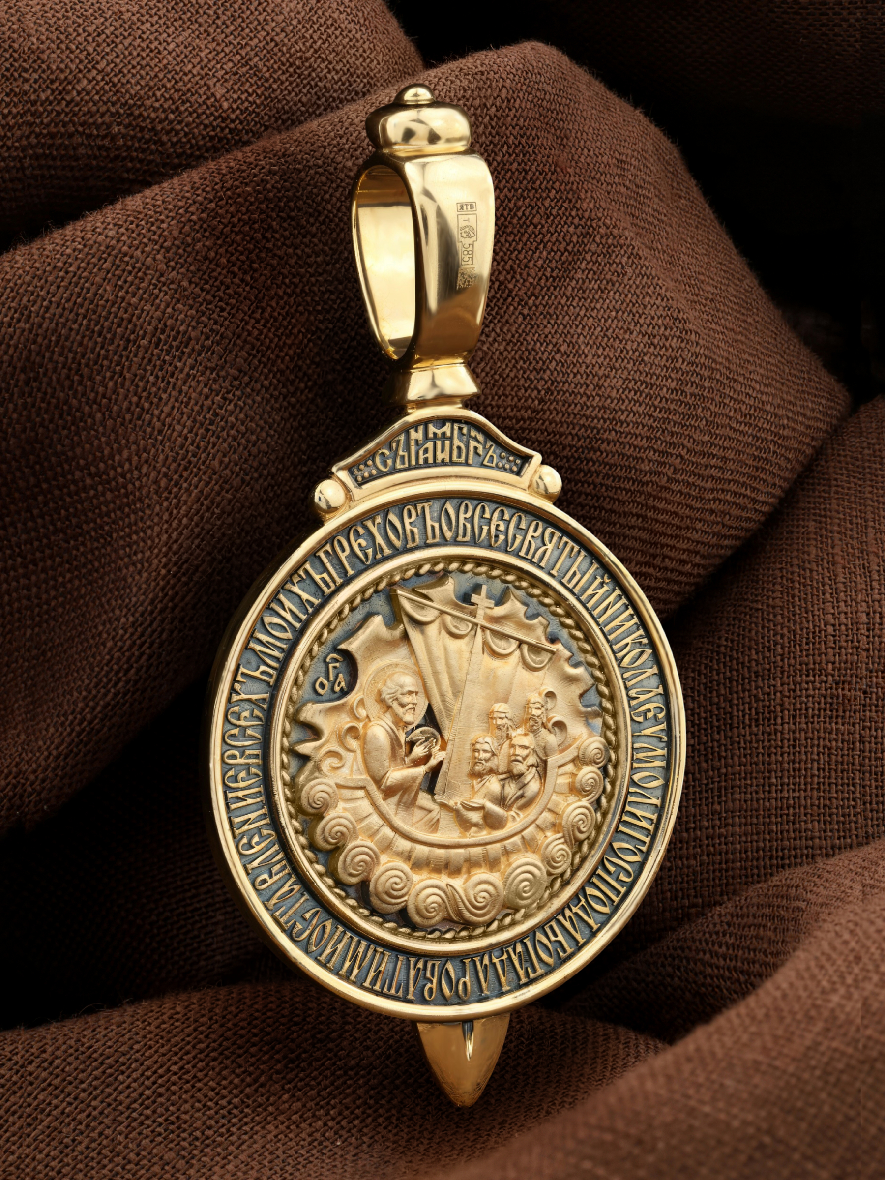 На оборотной стороне образка изображен Святитель Николай Чудотворец, архиепископ Мир Ликийских. Он является одним из самых почитаемых святых в православном мире, издревле считающийся помощником и молитвенником за всех, притекающих к нему. Вся жизнь святого Николая — это служение Богу. Чудес его исчислить невозможно. Одним из чудес было спасение Святым Угодником Николаем погибающих во время шторма моряков. Они никогда не видели епископа города Миры, но слышали о его чудесной помощи. В отчаянии они молитвенно воззвали к нему, и тот неожиданно появился на корме у руля и благополучно привел корабль в гавань. Этот сюжет изображен на образке и обрамлен словами молитвы: « О всесвятый Николае, умоли Господа Бога даровати ми оставление всех моих грехов».
