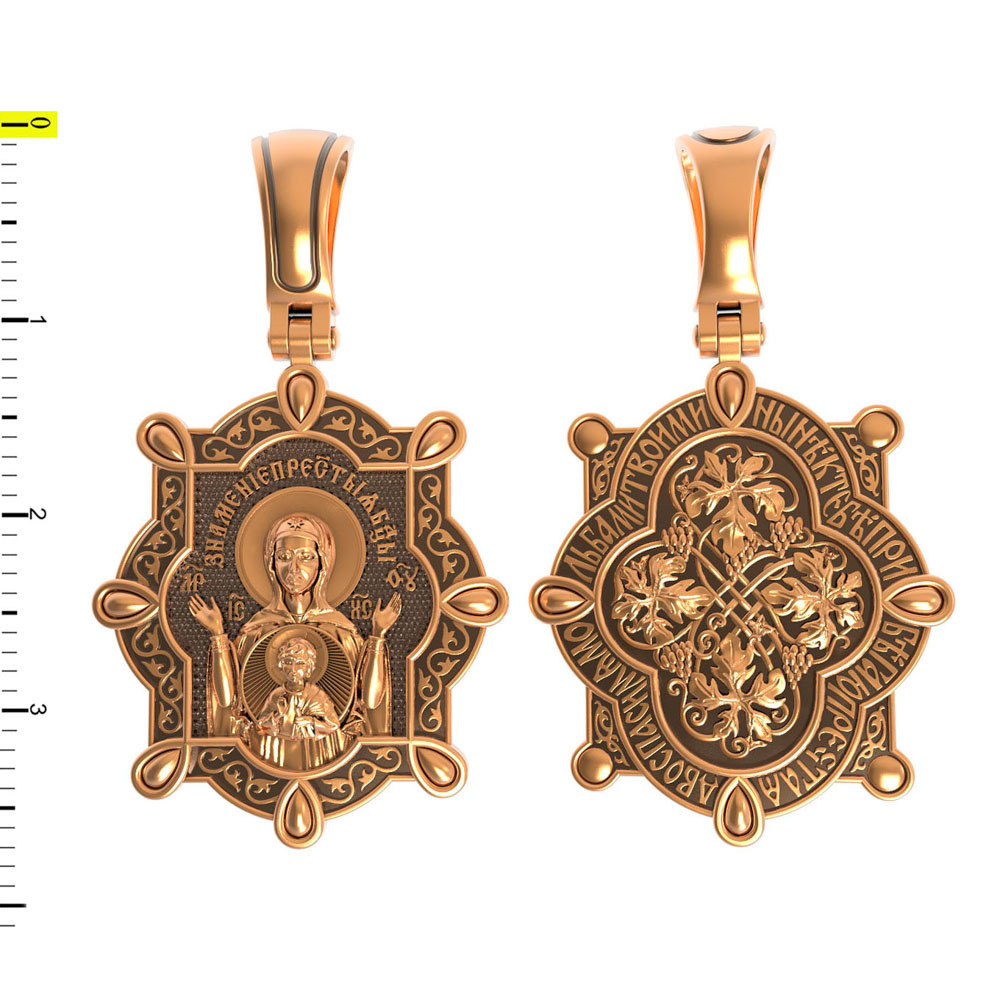 В центр образка помещен образ Божией Матери «Знамение», прославившийся многими чудесами в Новгороде в XII веке. Икона эта чтится как одна из самых великих святынь Русской земли. Молитвенно воздетые руки Богородицы означают заступничество за людей пред Богом. Рядом с Ней, на фоне круглого щита, — благословляющий Божественный Младенец — Спас-Эммануил.