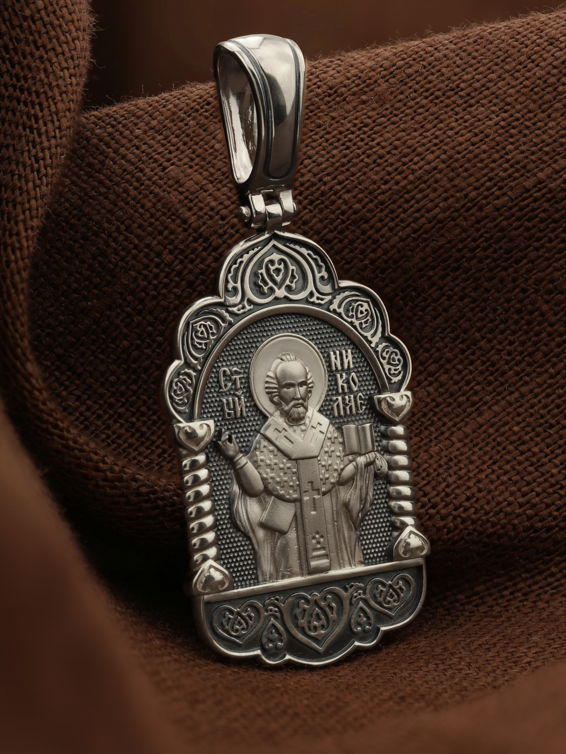 На лицевой стороне образка изображен Святитель Николай архиепископ Мир Ликийских, Чудотворец. Он является одним из самых почитаемых святых в православном мире. Святитель Николай родился во второй половине III века в Малой Азии в Ликийском городе Патары. С рождения Божий Угодник проявлял необыкновенные дарования. Сохранилось Предание, что во время крещения он, никем не поддерживаемый, простоял в купели три часа. Приняв сан священника, святитель Николай стал проводить еще более строгую подвижническую жизнь. Из­бран­ник Бо­жий Ни­ко­лай стал вершиной всех доб­ро­де­те­лей, подня­той до рай­ской вы­со­ты. С кем из ве­ли­чай­ших пра­вед­ни­ков не срав­нял­ся он об­ра­зом ду­хов­ной кра­со­ты, ко­му из них не по­сле­до­вал в сво­их де­я­ни­ях и чудотворениях? Вся жизнь святого Николая — это служение Богу. Много великих и преславных чудес сотворил великий Святитель Николай Угодник. Он помогал сущим в бедах, укрощал штормы, спасал от потопления и выносил на сушу из глубины морской, освобождал из плена и приносил освобожденных домой, избавлял от уз и темницы, защищал от посечения мечом, освобождал от смерти и подавал многим различные исцеления, слепым прозрение, хромым хождение, глухим слух, немым дар слова.