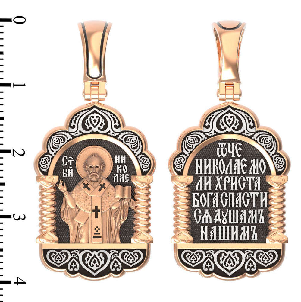 На лицевой стороне образка изображен Святитель Николай архиепископ Мир Ликийских, Чудотворец. Он является одним из самых почитаемых святых в православном мире. Святитель Николай родился во второй половине III века в Малой Азии в Ликийском городе Патары. С рождения Божий Угодник проявлял необыкновенные дарования. Сохранилось Предание, что во время крещения он, никем не поддерживаемый, простоял в купели три часа. Приняв сан священника, святитель Николай стал проводить еще более строгую подвижническую жизнь. Избранник Божий Николай стал вершиной всех добродетелей, поднятой до райской высоты. С кем из величайших праведников не сравнялся он образом духовной красоты, кому из них не последовал в своих деяниях и чудотворениях? Вся жизнь святого Николая — это служение Богу. Много великих и преславных чудес сотворил великий Святитель Николай Угодник. Он помогал сущим в бедах, укрощал штормы, спасал от потопления и выносил на сушу из глубины морской, освобождал из плена и приносил освобожденных домой, избавлял от уз и темницы, защищал от посечения мечом, освобождал от смерти и подавал многим различные исцеления, слепым прозрение, хромым хождение, глухим слух, немым дар слова.