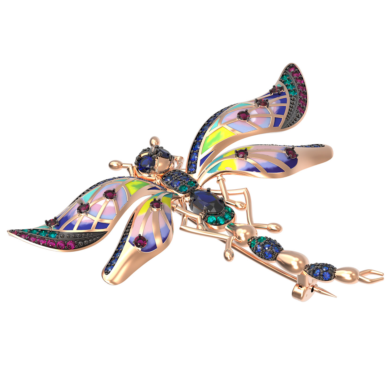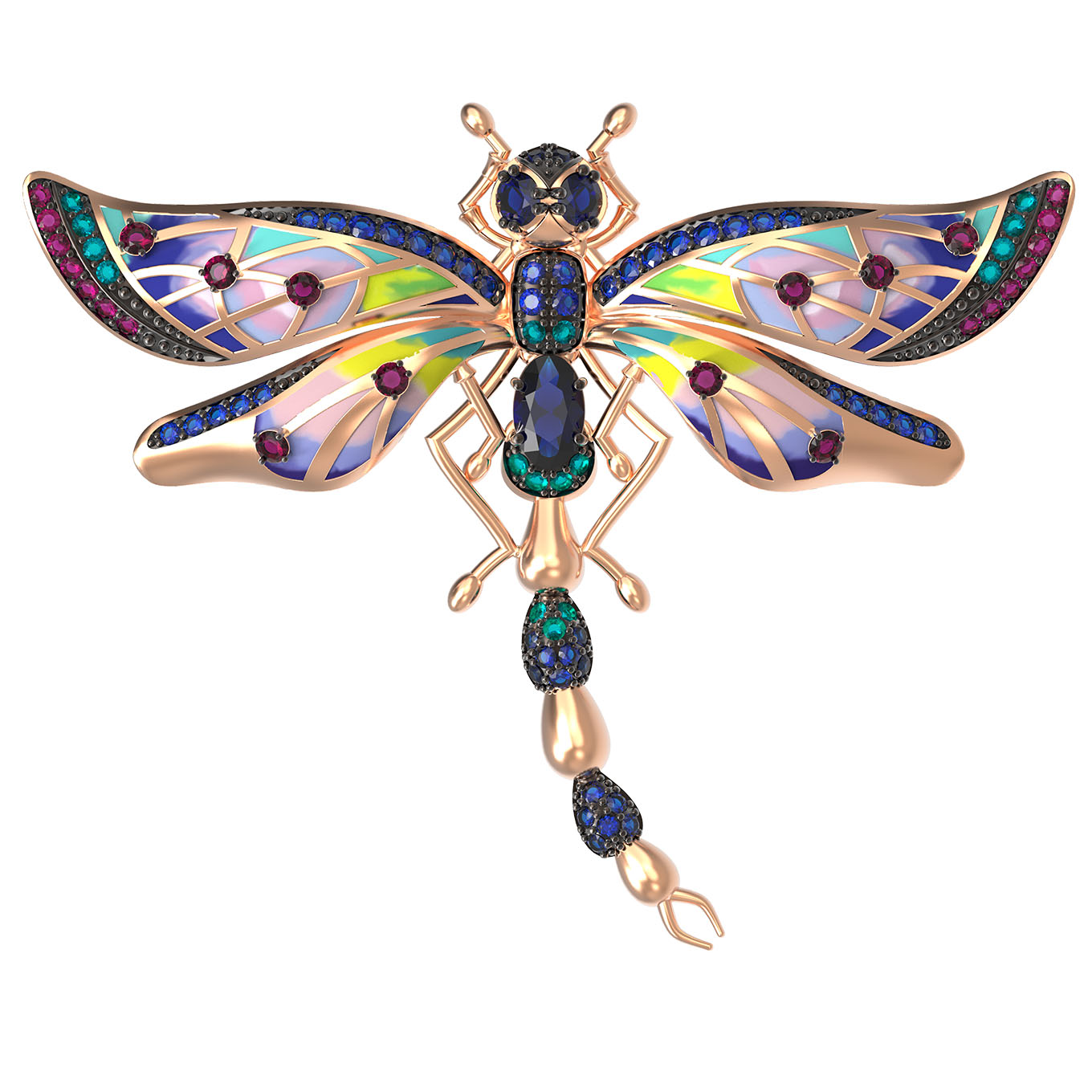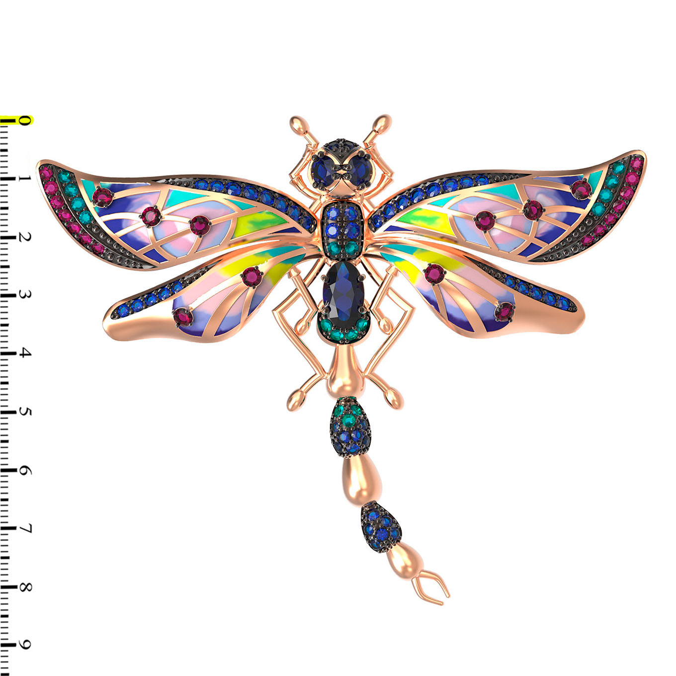 Брошь из золота c фианитом, рубином, сапфиром и эмалью