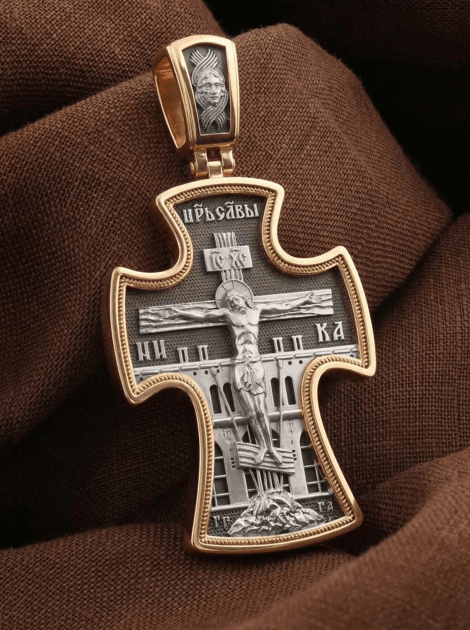 Оборотную сторону креста возглавляет икона святителя Николая Чудотворца, которого еще называют Николай Угодник за то, что он угодил своей жизнью Богу. Николай Чудотворец, помощник в делах, покровитель учащихся, утешитель обиженных. Также Святитель Николай Чудотворец известен своими молитвами за путешественников, когда непрестанный ветер и бушующие волны утихают и корабль заходит в спокойную гавань. На кулонном кольце изображен Спас Нерукотворный — Символ вочеловечившегося Божества и четырехкрылый Херувим.