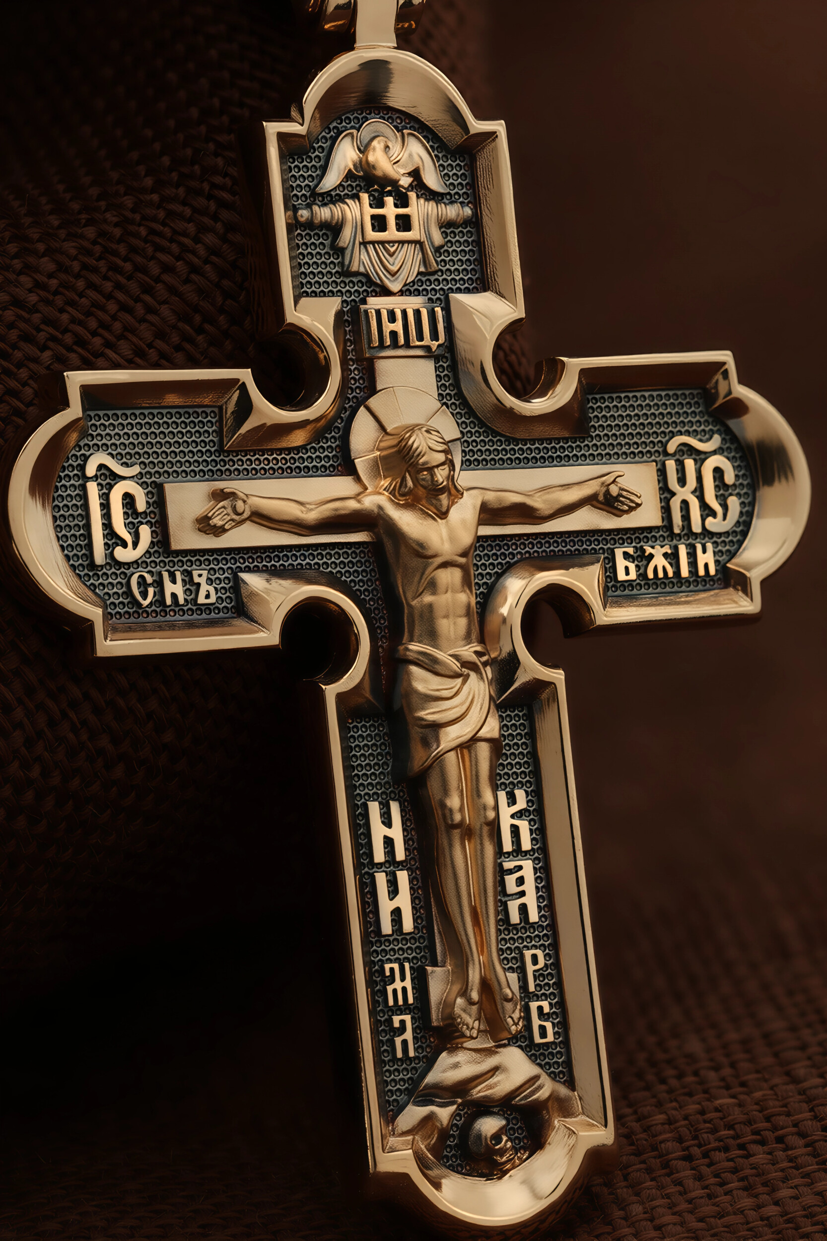 На лицевой стороне креста изображено Распятие Господа и Спасителя нашего Иисуса Христа. Крест- символ спасения и искупления рода человеческого, знамение победы над смертью и адом. Иисус Христос, как искупительная жертва освобождения человечества от власти греха, умер крестной смертью и в третий день воскрес. Верхняя перекладина символизирует титло — табличку, на которой, согласно Евангелию, было начертано: Иисус Назорей Царь Иудейский (IНЦI). Надпись «IC» «ХC», означает Иисус Христос, помещается на разных сторонах поперечной перекладины креста. Ниже перекладины расположено словосочетание «СЫН БОЖИЙ», что означает божественную природу Иисуса Христа. Надпись «МЛРБ» — «место лобное рай бысть» означает, что место лобное стало раем и помещаются в нижней части креста. Рядом — слово «НИКА», что означает «победитель». Возвышение, на котором стоит Крест, символизирует гору Голгофу, на которой произошло Распятие. Под подножием Креста изображена покоящаяся голова (череп) Адама. На кулонном кольце изображен шестикрылый Серафим.
