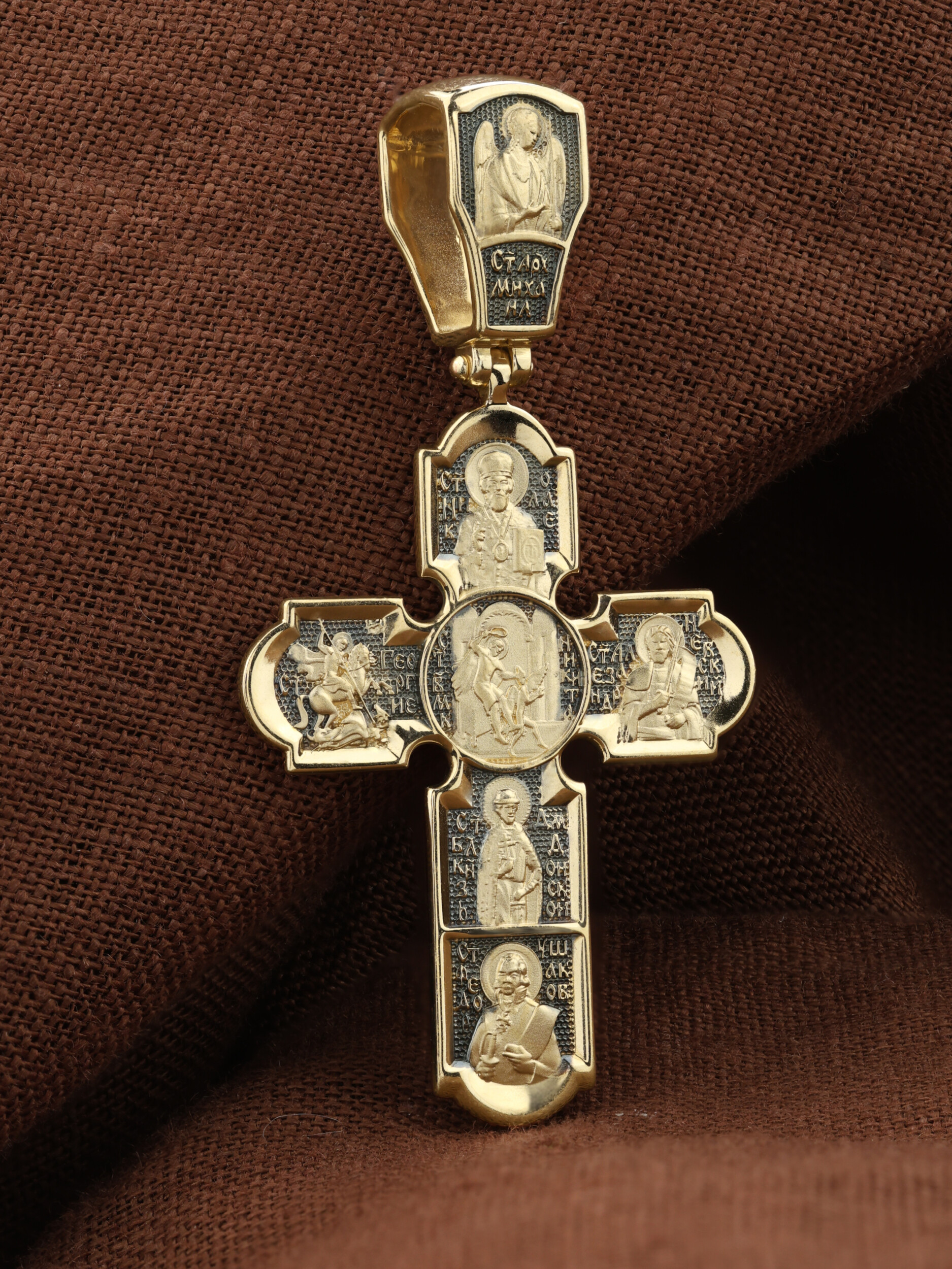 На лицевой стороне креста изображено Распятие Господа и Спасителя нашего Иисуса Христа. Христос, подвергнутый на кресте мучительной казни, своими страданиями искупил нас от древнего греха и даровал нам жизнь вечную. Без Распятия не было бы Воскресения Христова, и поэтому Крест из орудия казни обратился в святыню, в которой действует Благодать Божия. Над Распятием изображен Дух Святой в виде голубя, сходящего с Небес. Распятие сопровождается каноническими надписями. На верхней табличке, выше головы Иисуса, расположена надпись, составленная Понтием Пилатом на трех языках — «IНЦI». Она означает «Иисус Назорей, Царь Иудейский». Надпись «IС ХС» означает Иисус Христос и помещается на разных сторонах поперечной (большой) перекладины креста. Ниже — словосочетание «СЫН БОЖИЙ», что означает божественную природу Иисуса Христа. Крест стоит на горе камней, символизирующих Голгофу. В ее основании различается череп — это голова Адама. Надписи «Ника», что означает Победитель, и надпись «МЛРБ» — «место лобное рай бысть», что означает место лобное стало раем, размещены в нижней части креста. На кулонном кольце изображен шестикрылый Серафим.