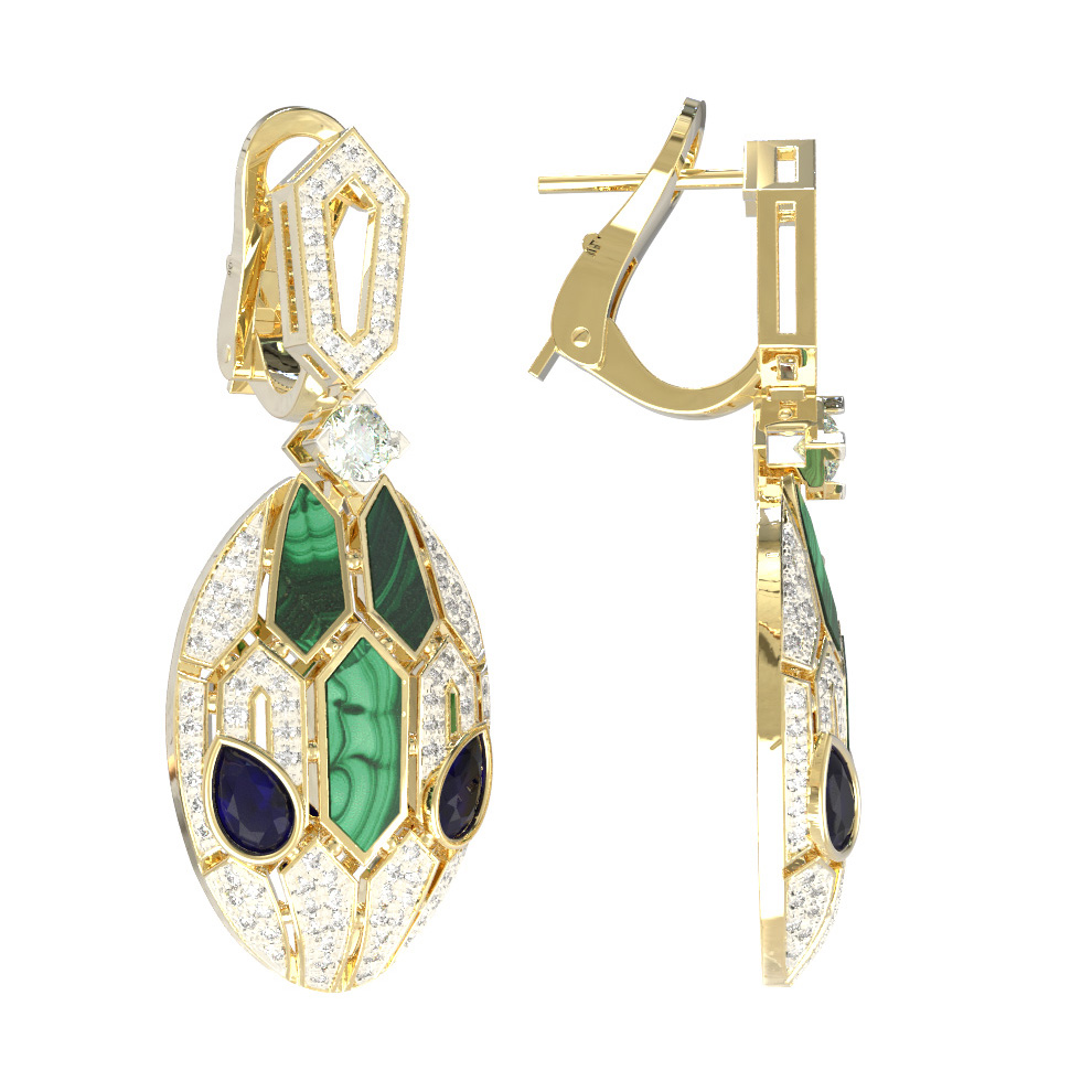 Серьги из лимонного золота c бриллиантами, сапфиром и малахитом
