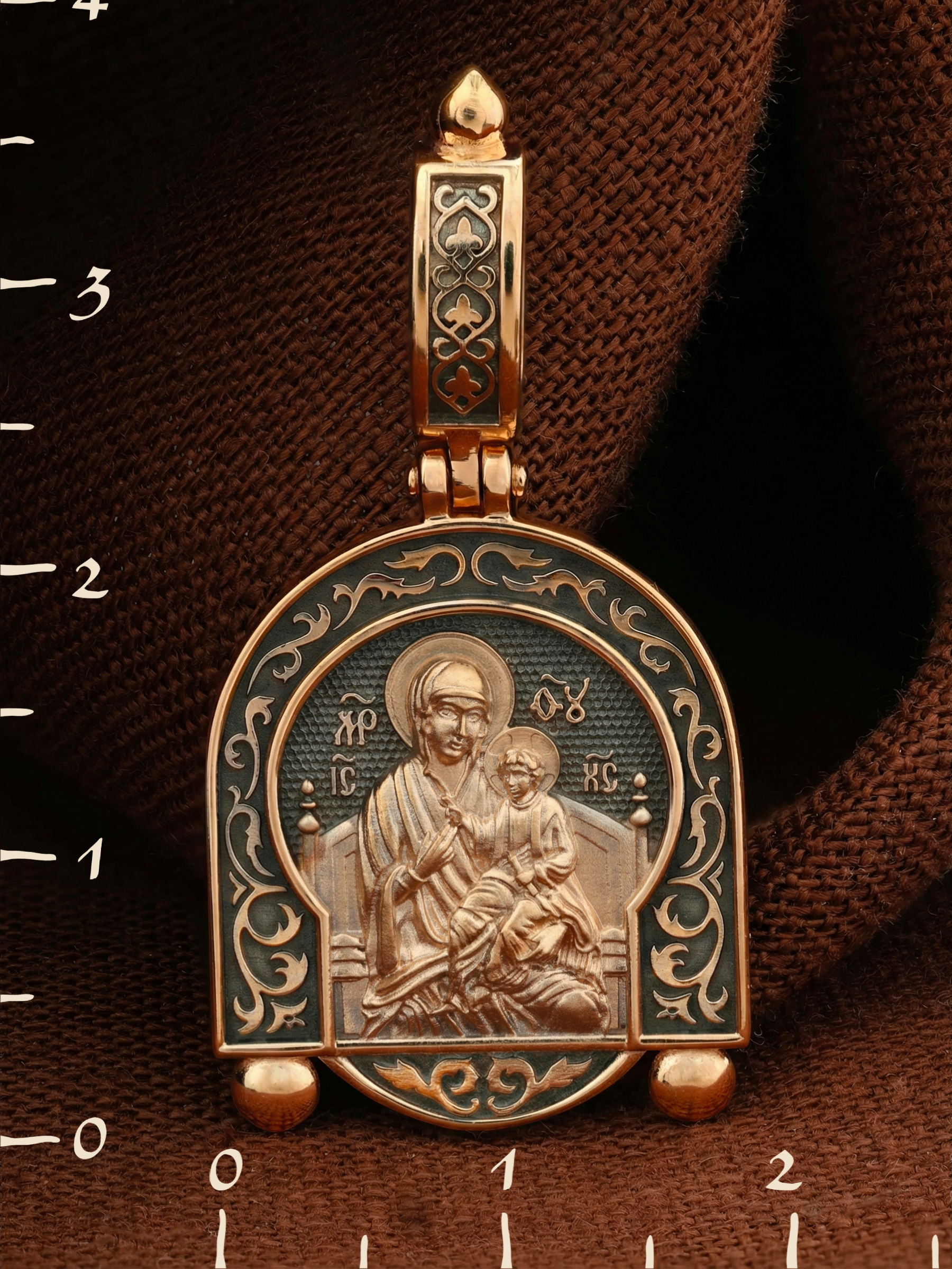 В центр образка помещен образ Божией Матери «Всецарица», восседающая на царском троне. На руках Ее — Богомладенец Иисус Христос со свитком в левой руке. Пальцы Его правой руки сложены в благословляющем жесте.