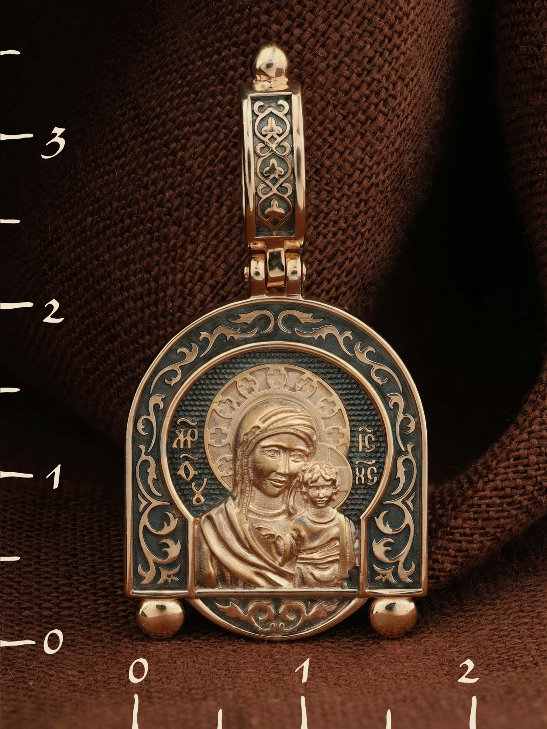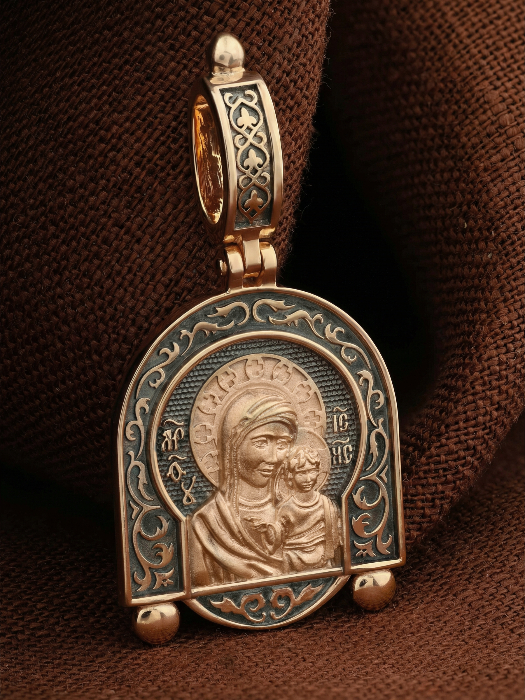 На лицевой части образка изображена Казанская икона Божией Матери — одна из самых почитаемых в России чудотворных икон Богородицы. Богословское значение Казанской иконы — указать верующим истинный Путь к спасению, который лежит через Христа. Только Божия Матерь имеет настолько сильное дерзновение к Спасителю, что может ходатайствовать перед Ним за всех верных. Именно этот образ дарится новой повенчанной паре, как хранитель очага и семейная реликвия. Молитва перед Казанской иконой Божьей Матери помогает во всех сложных случаях жизни, в болезнях, во всех печалях, невзгодах, скорбях. Уникальная история появления, чудеса, случившиеся по молитвам православных людей возле образа — все это делает Казанскую Богородицу особенной, среди тысяч других икон.