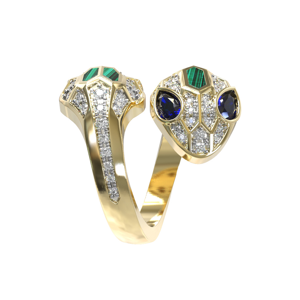 Кольцо из лимонного золота c бриллиантами, сапфиром и малахитом