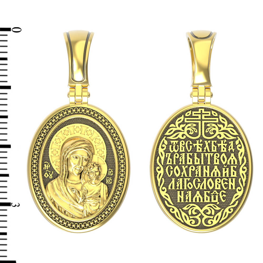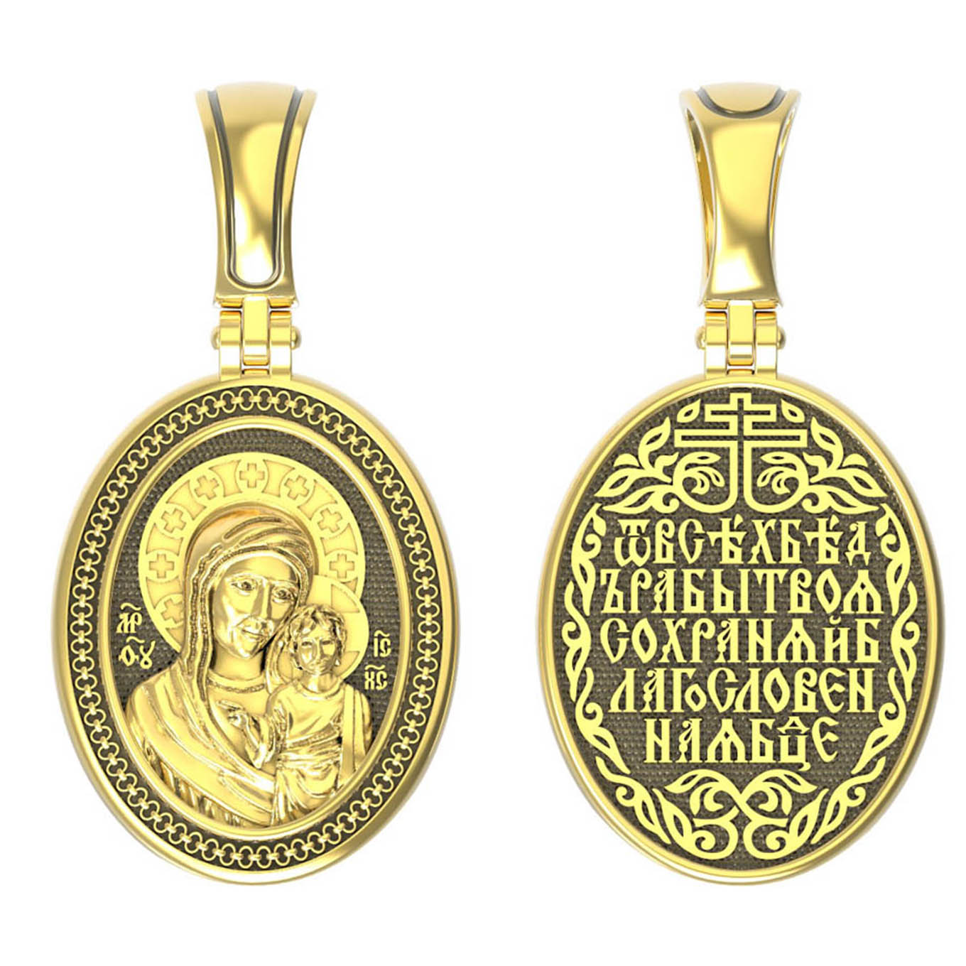 На лицевой части образка изображена Казанская икона Божией Матери — одна из самых почитаемых в России чудотворных икон Богородицы. Богословское значение Казанской иконы — указать верующим истинный Путь к спасению, который лежит через Христа. Только Божия Матерь имеет настолько сильное дерзновение к Спасителю, что может ходатайствовать перед Ним за всех верных. Именно этот образ дарится новой повенчанной паре, как хранитель очага и семейная реликвия. Молитва перед Казанской иконой Божьей Матери помогает во всех сложных случаях жизни, в болезнях, во всех печалях, невзгодах, скорбях. Уникальная история появления, чудеса, случившиеся по молитвам православных людей возле образа — все это делает Казанскую Богородицу особенной, среди тысяч других икон.