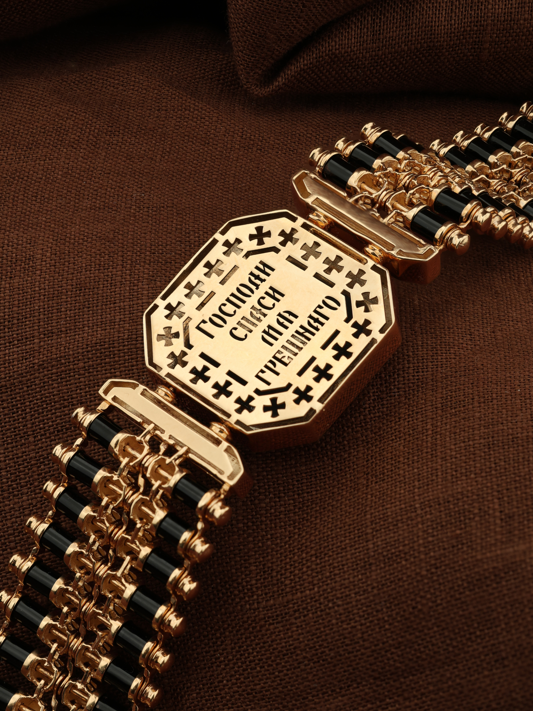 На лицевой стороне основного звена изображена икона Господа и Спасителя нашего Иисуса Христа — Господь Вседержитель или Пантократор (от греч. всевластный, всесильный). Он представлен как Царь Небесный и будущий Судия мира. Именование Иисуса «Вседержителем» указывает, с одной стороны, на Его Божественную природу: «Аз есмь Альфа и Омега, начало и конец, говорит Господь, Который есть и был и грядет, Вседержитель» (Откр. 1: 8). С другой стороны, такое именование связано и с человеческой природой Христа, искупившего крестной жертвой людские грехи и обновившего тем самым человеческую природу. Господь Иисусь Христос изображен фронтально огрудно. Главу Спасителя осеняет нимб, на нем угадывается крест. Крест символизирует голгофскую жертву Спасителя. По греческой традиции, на нимбе написаны буквы Омега, Омикрон, Ню — вместе они обозначают слово Сущий, одно из имен и характеристику Бога, согласно Священному Писанию. Правой рукой Он благословляет, а левой держит Евангелие — благую весть, принесенную Христом всему миру. Также означает она тот новый мир, который будет сотворен Богом после второго пришествия Христа. Символизирует и Книгу Жизни, где записаны имена всех, возлюбивших Бога. Всемогущий Бог предстает здесь не как обличающий судья, а как милостивый отец, ждущий возвращения блудных детей.